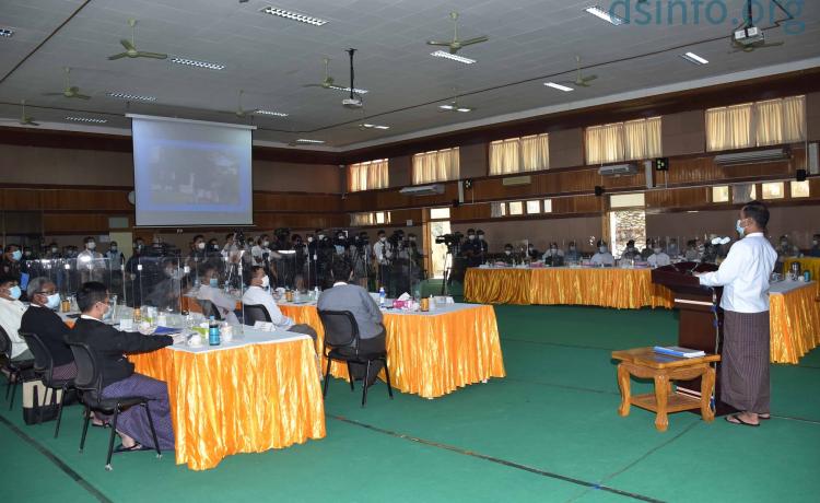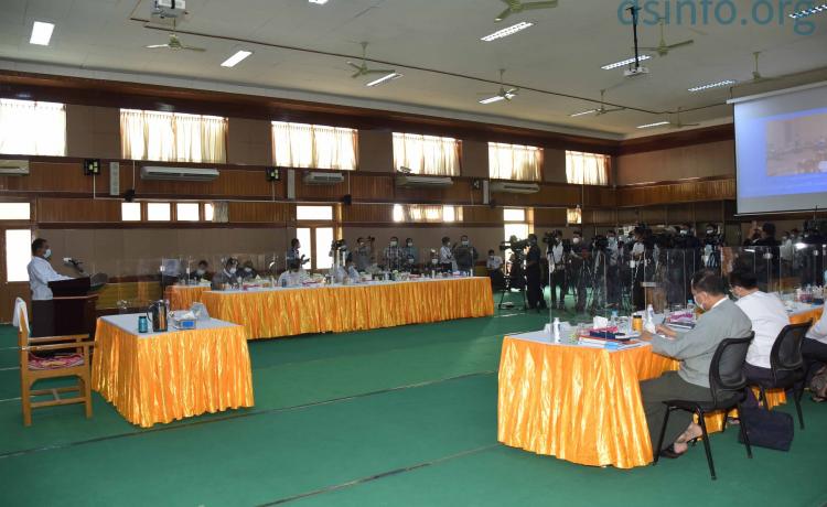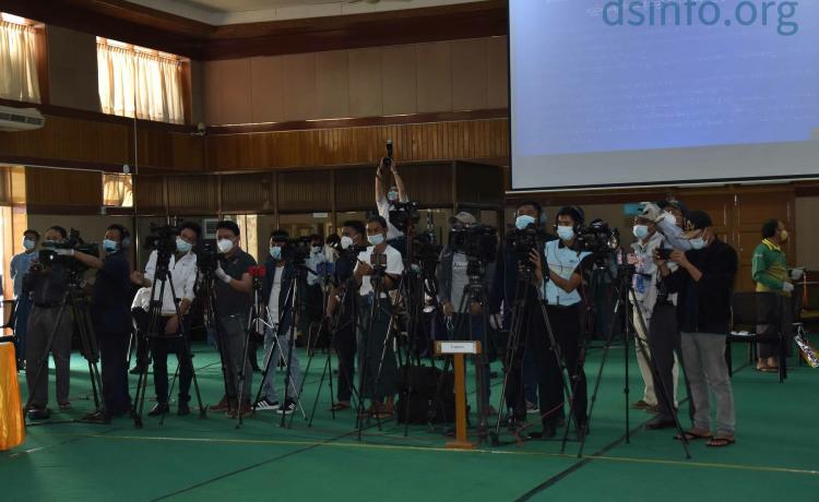 သတင်းစာရှင်းလင်းပွဲမစတင်မီ တက်ရောက်လာကြသူများအား COVID-19 ရောဂါ ကြိုတင်ကာကွယ်ရေးအတွက် တာဝန်ရှိသူများက လိုအပ်သည့် ကျန်းမာ ရေးဆိုင်ရာများဆောင်ရွက်ပေးပြီး သတ်မှတ်အကွာအဝေးအတိုင်း နေရာချထား ပေးသည်။