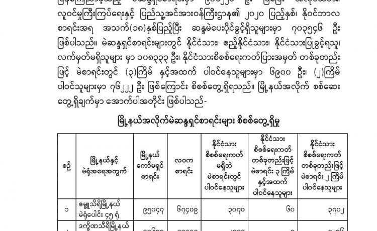 တိုင်းဒေသကြီးနှင့် ပြည်နယ်များရှိ တိုင်းရင်းသားပြည်သူများ၏ ကျန်းမာရေး ဆိုင်ရာ အခက်အခဲများကို တစ်ထောင့်တစ်နေရာမှ အထောက်အကူပြုစေရန်အတွက် မြို့နယ် အသီးသီး ရှိ တပ်မတော်ဆေးရုံများနှင့် ယာယီကုသရေးဆေးရုံများတွင် ကျန်းမာရေး စောင့်ရှောက်မှုများကို ဆောင်ရွက်ပေးလျက်ရှိပြီး ပြင်ပမှဆရာဝန်များသည်လည်း ၎င်းတို့၏ သဘောဆန္ဒအလျှောက် ကုသရေးလုပ်ငန်းများတွင် လာရောက်ပူးပေါင်း ဆောင်ရွက် ပေးလျက် ရှိကြောင်း သိရှိရသည်။