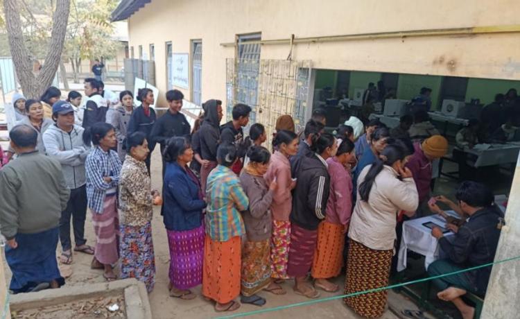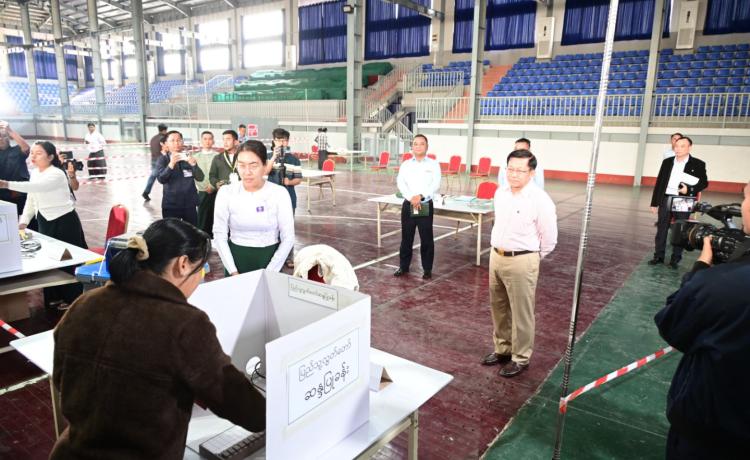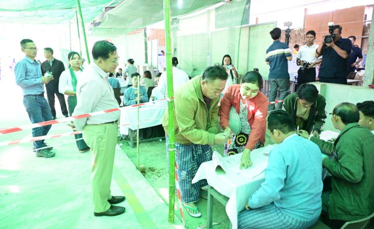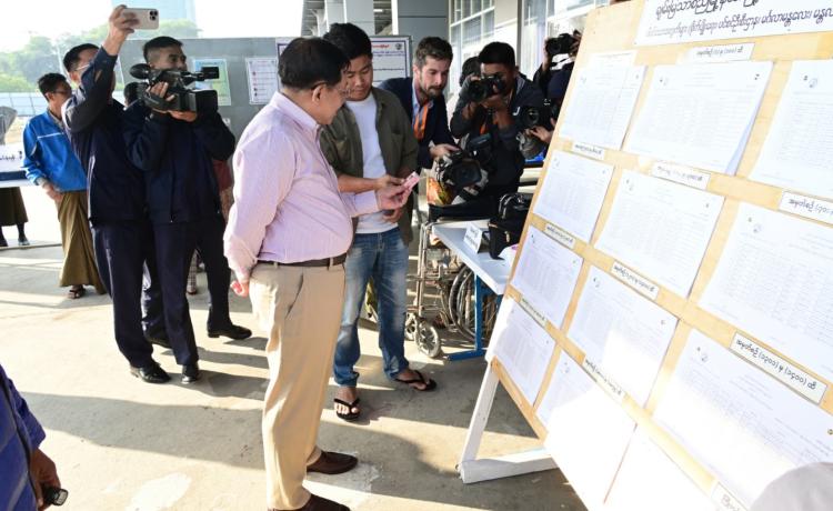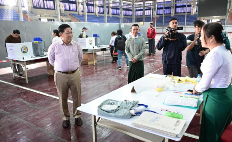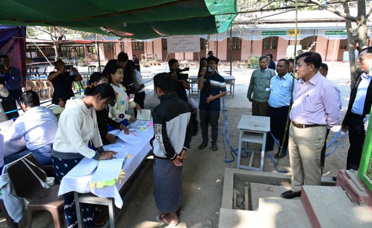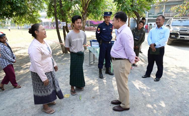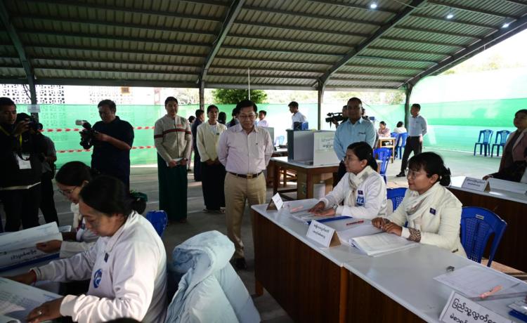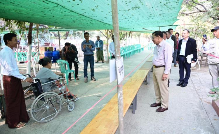 နိုင်ငံတော်ယာယီသမ္မတ နိုင်ငံတော်လုံခြုံရေးနှင့် အေးချမ်းသာယာရေးကော်မရှင်ဥက္ကဋ္ဌ ဗိုလ်ချုပ်မှူးကြီး မင်းအောင်လှိုင် ပြည်ထောင်စုသမ္မတမြန်မာနိုင်ငံတော် ၂၀၂၅ ခုနှစ် ပါတီစုံဒီမိုကရေစီ အထွေထွေရွေးကောက်ပွဲ အပိုင်း(၃)တွင် ပါဝင်ဆန္ဒမဲပေးနေကြသည့် မဲဆန္ဒရှင်ပြည်သူများအား မဲရုံများအလိုက် လိုက်လံကြည့်ရှုအားပေး