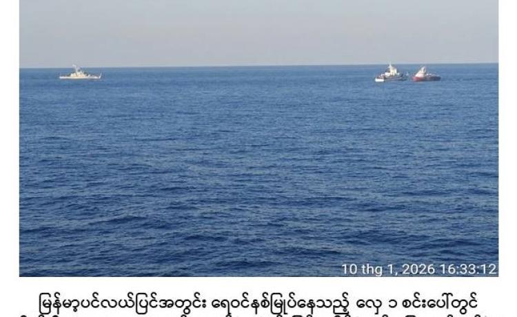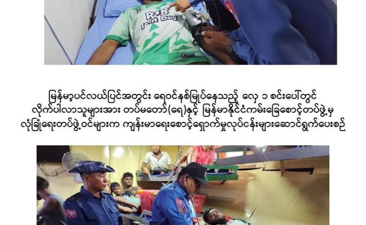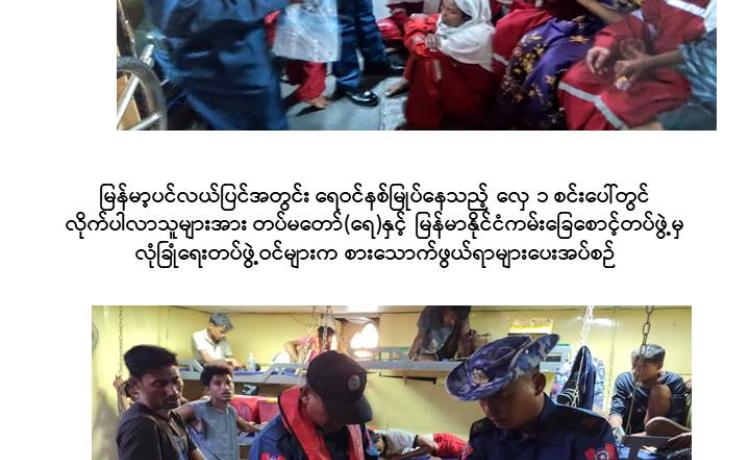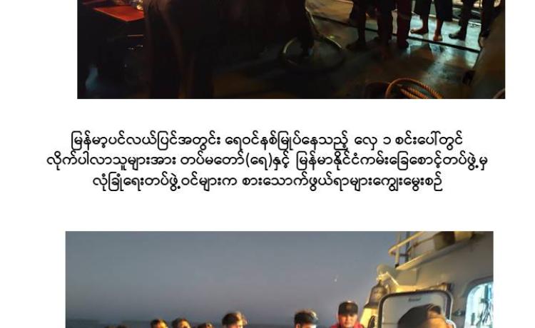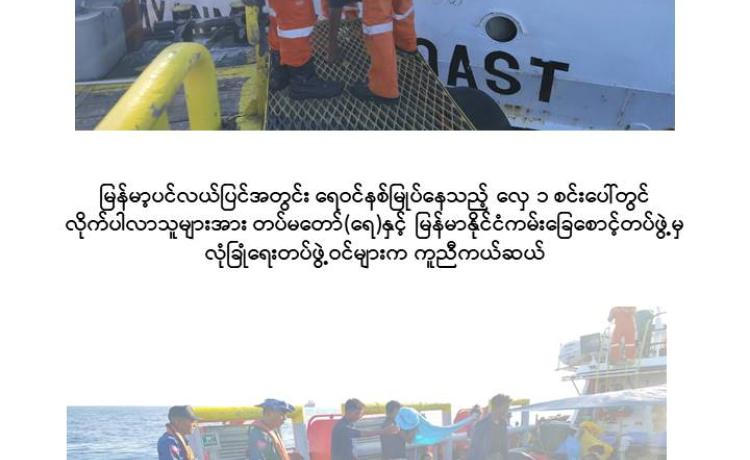 ရန်ကုန်တိုင်းဒေသကြီး၊ ရန်ကုန်မြို့၏ တောင်ဘက် ရေမိုင် ၁၅၆ မိုင်ခန့် အကွာရှိ မြန်မာ့ပင်လယ်ပြင်အတွင်း ရေဝင်နစ်မြုပ်နေသည့် လှေတစ်စင်းပေါ်မှ လိုက်ပါလာသူ များအား တပ်မတော်(ရေ)နှင့် မြန်မာနိုင်ငံကမ်းခြေစောင့်တပ်ဖွဲ့မှ လုံခြုံရေးတပ်ဖွဲ့ဝင်များ က ကူညီကယ်ဆယ်ရေးလုပ်ငန်းများ ဆောင်ရွက်ပေးခဲ့ကြောင်း သိရှိရသည်။