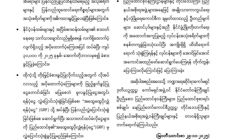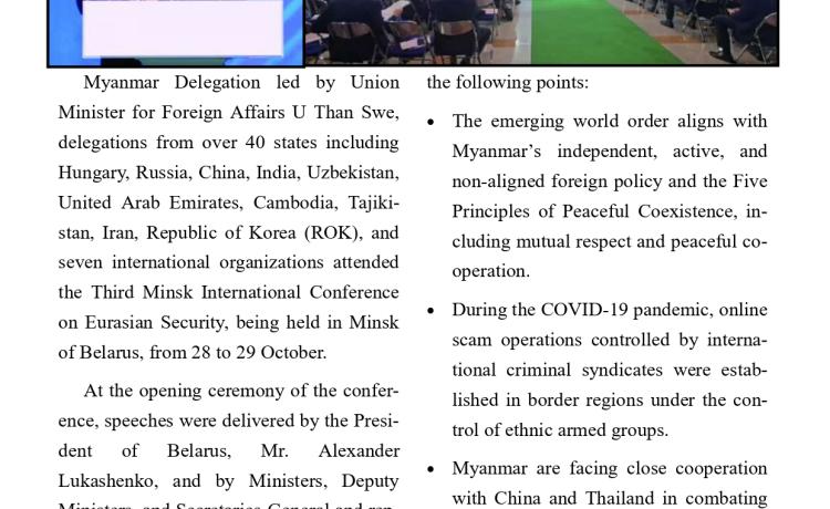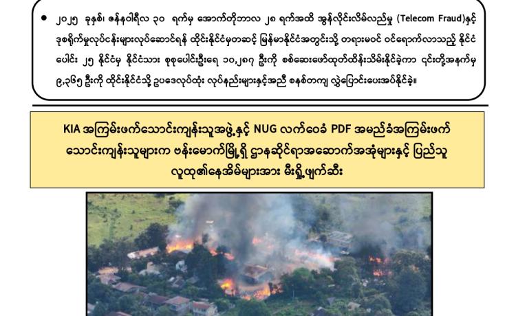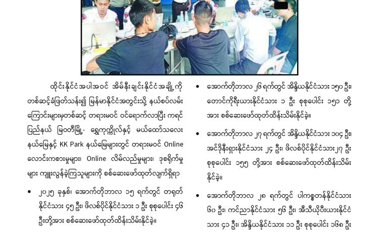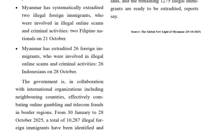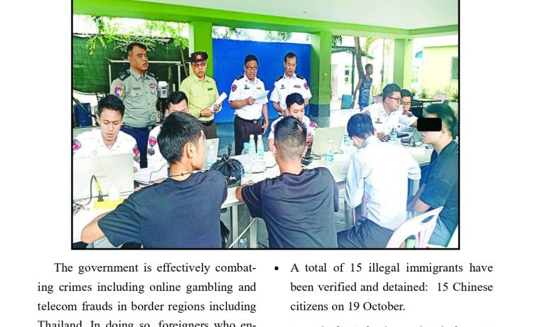 နိုင်ငံတော်အစိုးရအနေဖြင့် နယ်စပ်ဒေသများ၌ တရားမဝင် ဝင်ရောက်နေထိုင်ပြီး အွန်လိုင်း လောင်းကစားမှု၊ အွန်လိုင်းလိမ်လည်မှုအပါအဝင် ဒုစရိုက်မှုလုပ်ငန်းများတွင် ပါဝင်ဆောင်ရွက်ခဲ့ကြ သည့် ပြည်ပနိုင်ငံသားများကို စုံစမ်းစစ်ဆေးဖော်ထုတ်၍ သက်ဆိုင်ရာနိုင်ငံများသို့ ဥပဒေ၊ လုပ်ထုံး လုပ်နည်းများနှင့်အညီ စနစ်တကျ ပြည်နှင်လွှဲပြောင်းပေးအပ်လျက်ရှိသည်။
