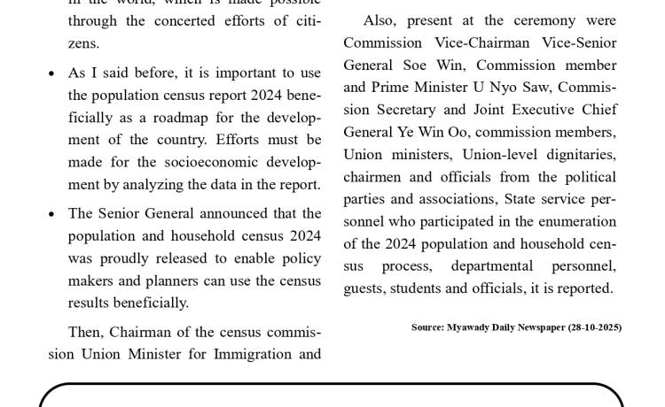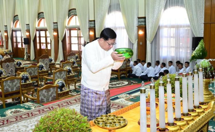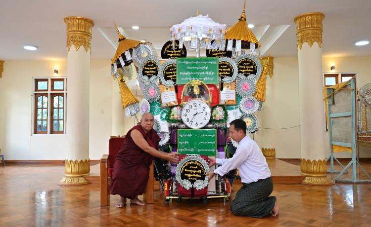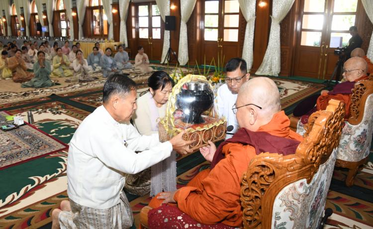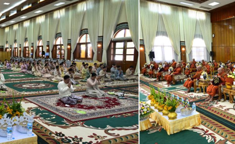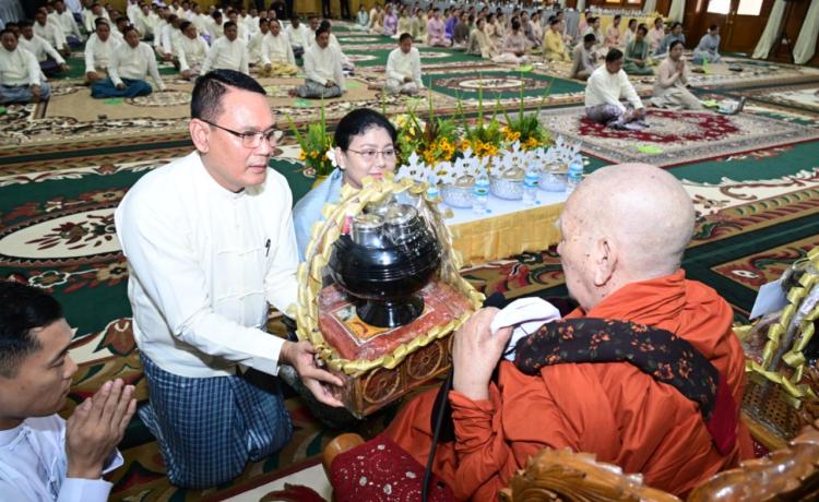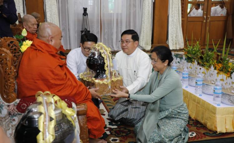 ကာကွယ်ရေးဦးစီးချုပ်ရုံး(ကြည်း၊ ရေ၊ လေ)မိသားစုများ၏ ၂၀၂၅ ခုနှစ်မဟာ ဘုံကထိန်အလှူတော်မင်္ဂလာအခမ်းအနားကို ယနေ့နံနက်ပိုင်းတွင် ကာကွယ်ရေး ဦးစီးချုပ်ရုံး(ကြည်း) အနော်ရထာခန်းမ၌ ဆင်ယင်ကျင်းပပြုလုပ်ရာ နိုင်ငံတော် လုံခြုံ ရေးနှင့် အေးချမ်းသာယာရေးကော်မရှင်ဥက္ကဋ္ဌ တပ်မတော်ကာကွယ်ရေးဦးစီးချုပ် ဗိုလ်ချုပ်မှူးကြီး မင်းအောင်လှိုင် နှင့် ဇနီး ဒေါ်ကြူကြူလှ တို့ တက်ရောက်၍ ကထိန်လျာသင်္ကန်းနှင့် လှူဖွယ်ပစ္စည်းများ ဆက်ကပ်လှူဒါန်းသည်။