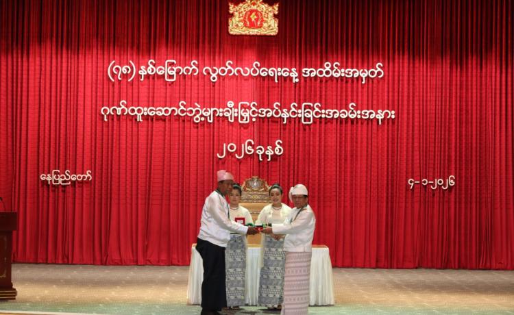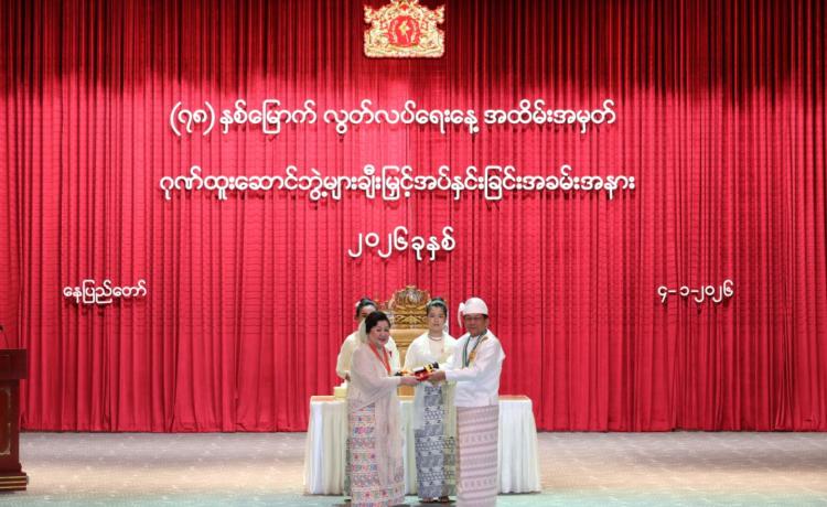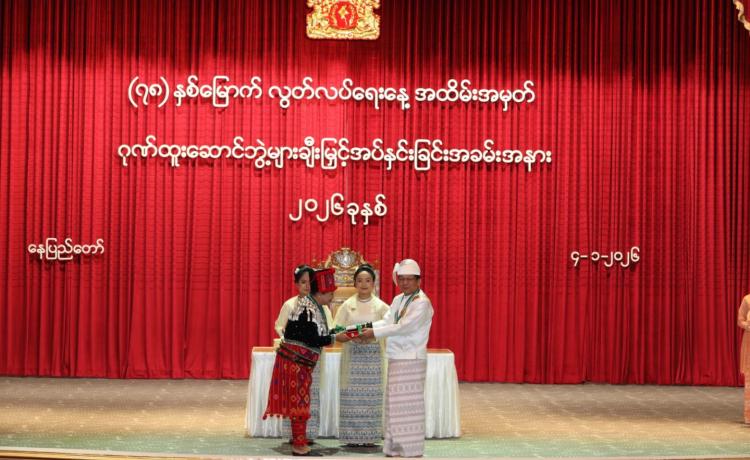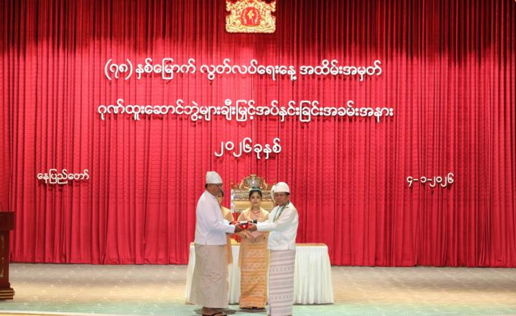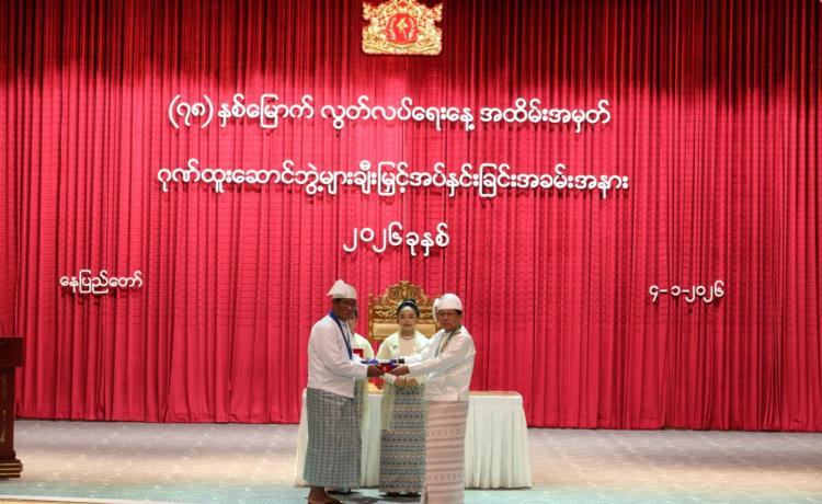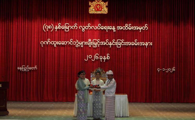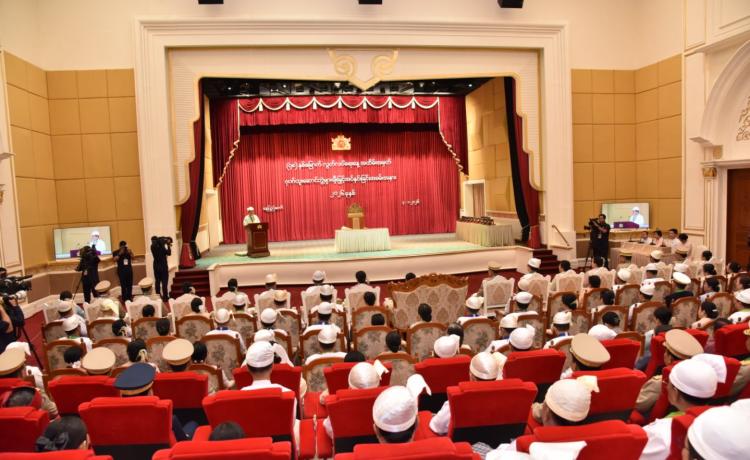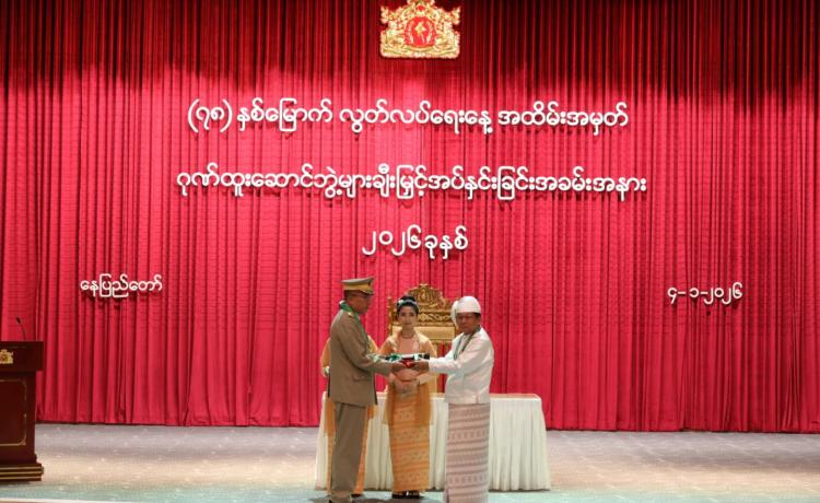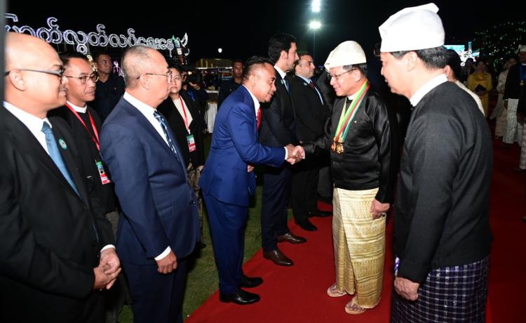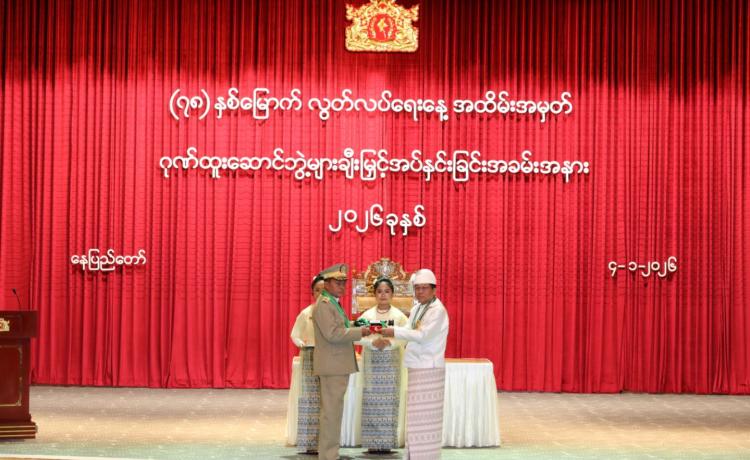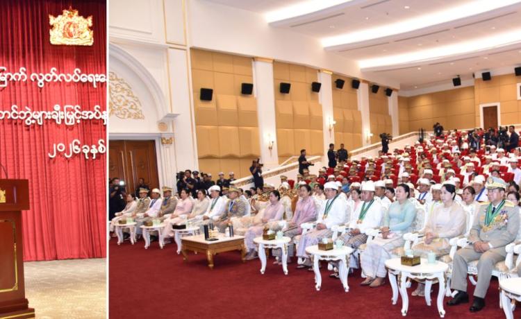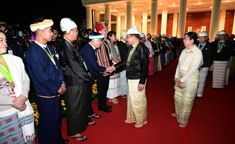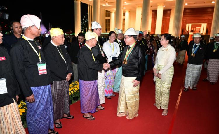 ပြည်ထောင်စုသမ္မတမြန်မာနိုင်ငံတော် ယာယီသမ္မတ နိုင်ငံတော်လုံခြုံရေးနှင့် အေးချမ်းသာယာရေးကော်မရှင်ဥက္ကဋ္ဌ ဗိုလ်ချုပ်မှူးကြီး သတိုးမဟာသရေစည်သူ သတိုးသီရိသုဓမ္မ မင်းအောင်လှိုင် (၇၈) နှစ်မြောက်လွတ်လပ်ရေးနေ့အထိမ်းအမှတ် ဂုဏ်ထူးဆောင်ဘွဲ့များ ချီးမြှင့်အပ်နှင်းခြင်းအခမ်းအနားသို့ တက်ရောက်ချီးမြှင့်