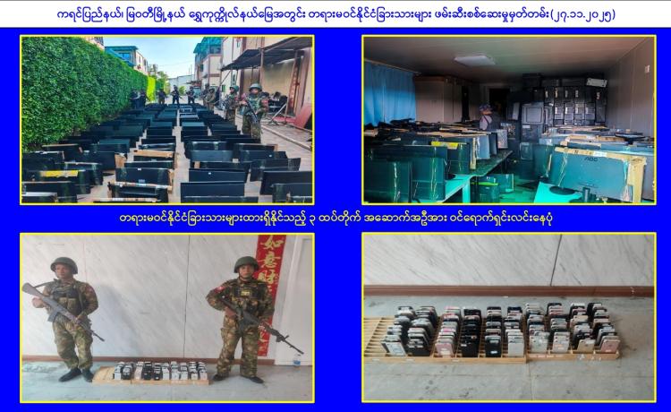 နိုင်ငံတော်အစိုးရအနေဖြင့် Online လိမ်လည်လောင်းကစားမှုတိုက်ဖျက်ရေးလုပ်ငန်း များကို အမျိုးသားရေးတာဝန်တစ်ရပ်အဖြစ်ခံယူကာ မြန်မာနိုင်ငံအတွင်း လုံးဝအခြေမပြုနိုင် ရေးအတွက် ပြည်တွင်းအင်အားစုများအပြင် အိမ်နီးချင်းနိုင်ငံအစိုးရများနှင့်လည်း ပေါင်းစပ် ညှိနှိုင်း၍ အဆိုပါဒုစရိုက်မှုနှိမ်နင်းရေးလုပ်ငန်းများကို တက်ကြွစွာ ဆောင်ရွက်လျက်ရှိရာ နိုဝင်ဘာ ၂၄ ရက်၊ ၂၅ ရက်နှင့် ၂၆ ရက်တို့တွင် ရှမ်းပြည်နယ် (တောင်ပိုင်း)၊ ကျေးသီးမြို့နယ်၊ မိုင်းနောင်မြို့အနီး၌ အွန်လိုင်းလိမ်လည်လောင်းကစားမှုလုပ်ငန်းများလုပ်ကိုင်နေသည့် ပြည်ပ နိုင်ငံသား ၂၆ ဦးနှင့် မြန်မာနိုင်ငံသား ၈ ဦးကို အ