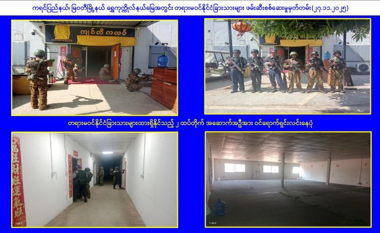 မြန်မာနိုင်ငံအစိုးရအနေဖြင့် အွန်လိုင်းလိမ်လည်မှုများနှင့် အွန်လိုင်းလောင်းကစားမှု များ အများဆုံးအခြေချလုပ်ကိုင်လျက်ရှိကြသည့် ရွှေကုက္ကိုလ်နယ်မြေနှင့် KK Park နယ်မြေများ၌ လုံခြုံရေးတပ်ဖွဲ့ဝင်များ၊ အုပ်ချုပ်ရေးအဖွဲ့အစည်းများနှင့် ဒေသတွင်း တာဝန်ရှိသူများအပါအဝင် အဖွဲ့စုံပါဝင်သည့် ပူးပေါင်းစစ်ဆင်ရေးအဖွဲ့များဖြင့် တရားမဝင် အဆောက်အအုံများအတွင်း ဝင်ရောက်ရှင်းလင်းခြင်း၊ အွန်လိုင်းလိမ်လည်လောင်းကစားမှု လုပ်ငန်းစဉ်များတွင်အသုံးပြုခဲ့သည့် သိမ်းဆည်းရမိပစ္စည်းများနှင့် တရားမဝင် အဆောက် အအုံများအား စနစ်တကျဖ