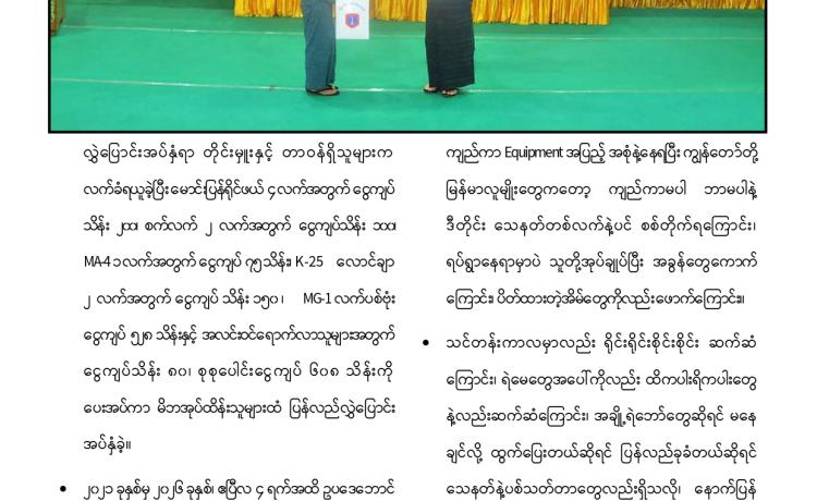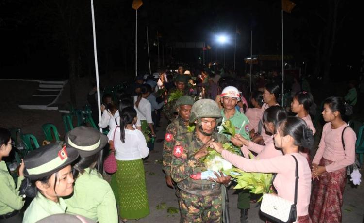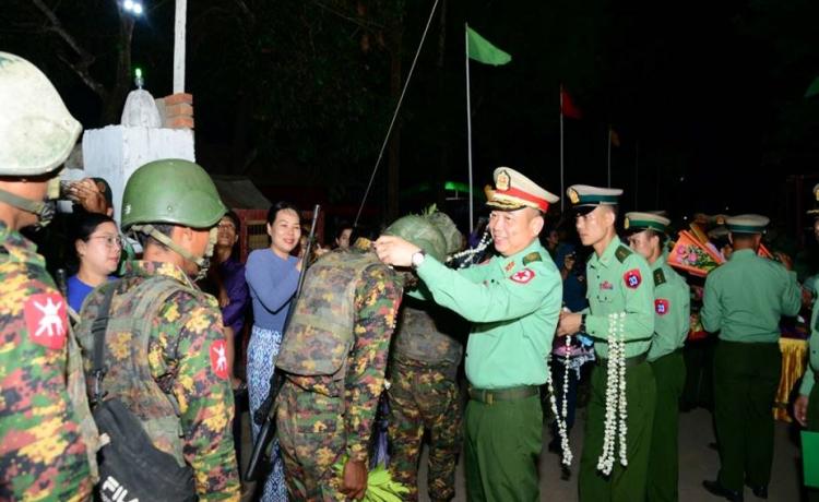 နိုင်ငံတော်တည်ငြိမ်ရေးနှင့် နယ်မြေအေးချမ်းသာယာရေးအတွက် ရခိုင်ပြည် နယ်၊ ကျောက်ဖြူမြို့နယ် ဒေသတဝိုက် နယ်မြေလုံခြုံရေးတာဝန်များကို ထမ်းဆောင်၍ ပြန်လည်ရောက်ရှိလာသော ရှေ့တန်းပြန် နိုင်ငံ့သားကောင်း တပ်မတော်သားများအား ဂုဏ်ပြုကြိုဆိုခြင်းကို ယနေ့ညနေပိုင်းတွင် ရန်ကုန်တိုင်းဒေသကြီး၊ လှည်းကူးမြို့နယ်၊ ရဲမွန်တပ်မြို့ရှိ နယ်မြေခံတပ်ရင်း၌ ပြုလုပ်ရာ ရန်ကုန်တိုင်းစစ်ဌာနချုပ် တိုင်းမှူး ဗိုလ်မှူးချုပ် တင်မင်းလတ်နှင့် တာဝန်ရှိသူများ၊ မြန်မာနိုင်ငံရဲတပ်ဖွဲ့ဝင်များ၊ မြန်မာ နိုင်ငံစစ်မှုထမ်းဟောင်းအဖွဲ့ဝင်များ၊ ဌာနဆိုင်ရာတာဝန်ရှိသူများနှင့် ဒေသခံပြည်သူ များ ပါဝင်တက်ရောက် ဂုဏ်ပြုကြိုဆိုကြသည်။