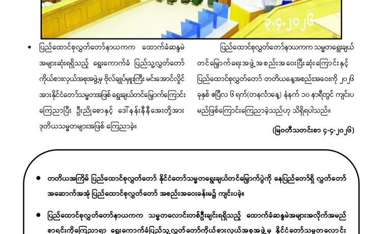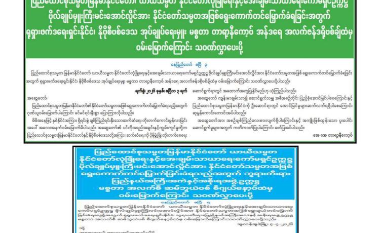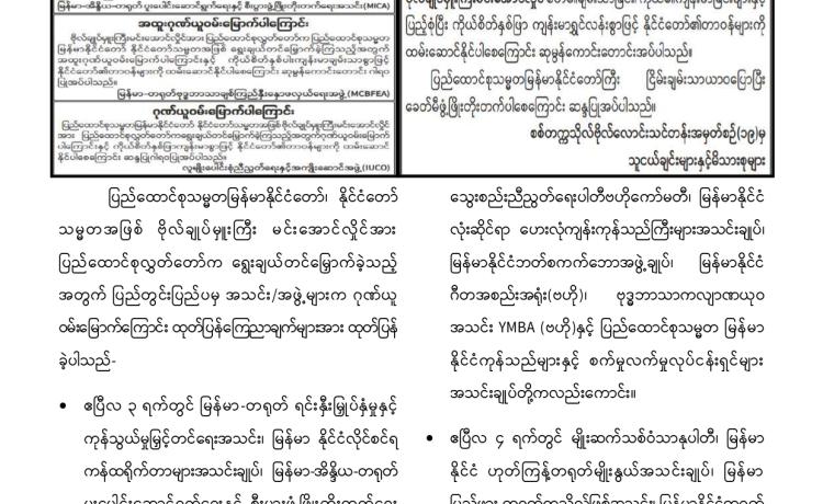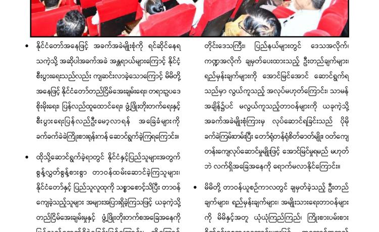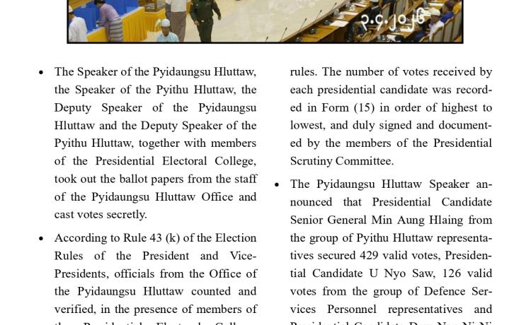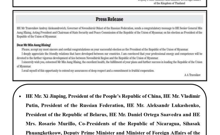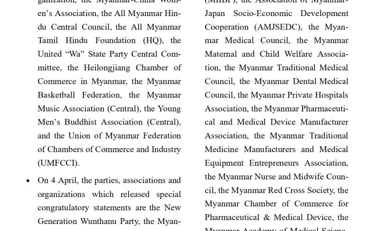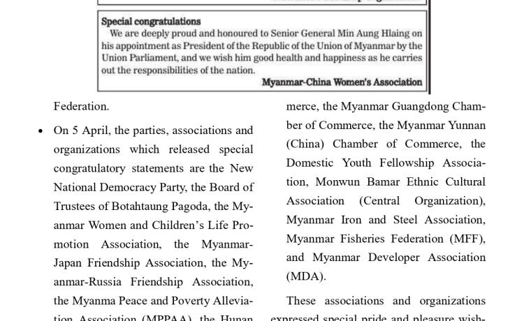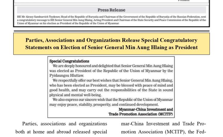 ဗိုလ်ချုပ်မှူးကြီး မင်းအောင်လှိုင်အား နိုင်ငံတော်သမ္မတအဖြစ် ရွေးချယ်တင်မြှောက်ခြင်း ခံရသည့်အတွက် အသင်း/အဖွဲ့များနှင့် ကော်မတီတို့က အထူးဂုဏ်ယူဝမ်းမြောက်ကြောင်း ထုတ်ပြန်ကြေညာချက်များ ထုတ်ပြန်
