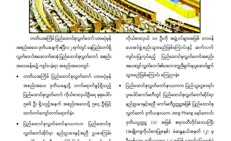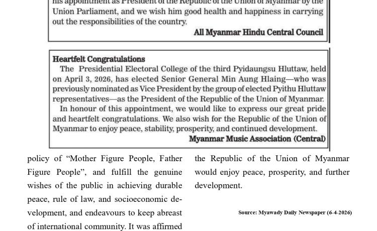 ၂၀၂၆ ခုနှစ်၊ ဧပြီလ ၃ ရက်တွင် ကျင်းပသည့် နိုင်ငံတော်သမ္မတ ရွေးချယ် တင်မြှောက်ပွဲ၌ ပြည်ထောင်စုလွှတ်တော်ကိုယ်စားလှယ် အားလုံးပါဝင်သော နိုင်ငံတော်သမ္မတ ရွေးချယ်တင်မြှောက်ရေးအဖွဲ့က ရွေးကောက်ခံ ပြည်သူ့လွှတ်တော် ကိုယ်စားလှယ်များ အစုအဖွဲ့မှ ဒုတိယသမ္မတအဖြစ် ရွေးချယ်တင်မြှောက်ထားသော ဗိုလ်ချုပ်မှူးကြီး မင်းအောင်လှိုင် အား နိုင်ငံတော်သမ္မတအဖြစ် ရွေးချယ်တင်မြှောက်ခြင်းခံရသည့်အတွက် မြန်မာနိုင်ငံတောင်သူလယ်သမားဖွံ့ဖြိုး တိုးတက်ရေးပါတီ၊ အမျိုးသားအကျိုးစီးပွား တိုးတက်ရေးပါတီ၊ ပအိုဝ်းအမျိုးသားအဖွဲ့ချုပ်(PNO)နှင့် မြန်မာနိုင်ငံစာရေးဆရာအသင်း တို့က အထူးဂုဏ်ယူဝမ်းမြောက်ကြောင်း ကြေညာချက်များ ထုတ်ပြန်ခဲ့ကြ