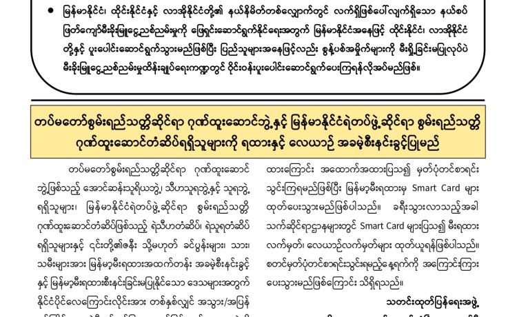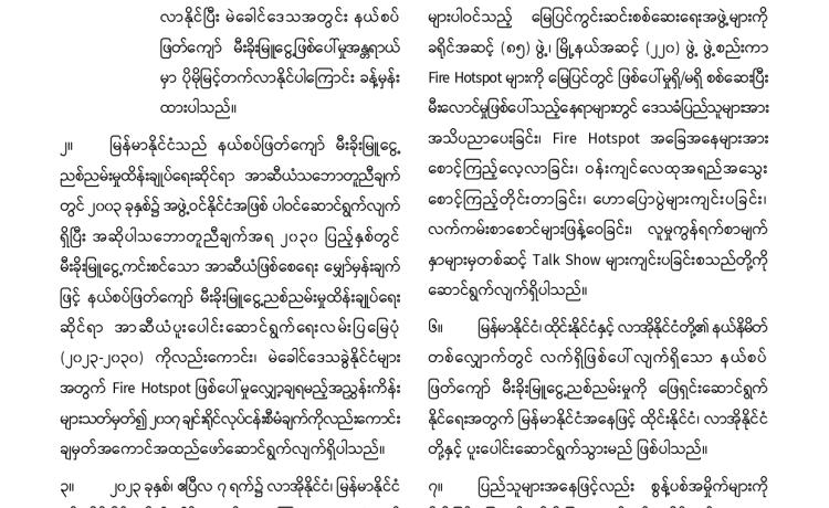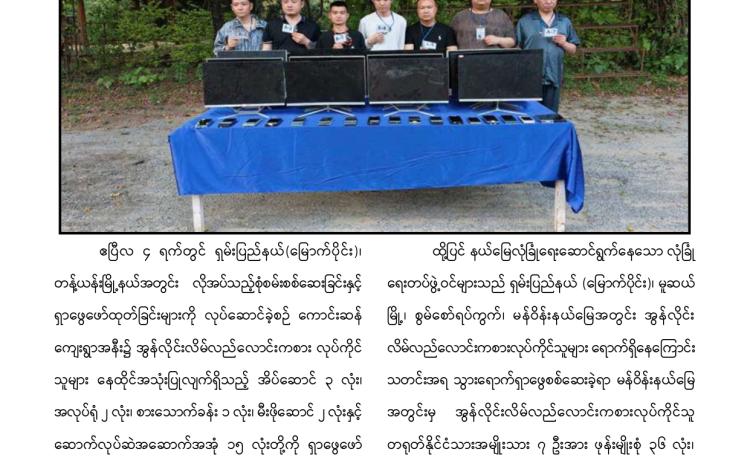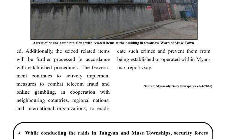 နိုင်ငံတော်အစိုးရအနေဖြင့် နယ်စပ်ဒေသများ၌ တရားမဝင် ဝင်ရောက်နေထိုင်ပြီး အွန်လိုင်း လောင်းကစားမှု၊ အွန်လိုင်းလိမ်လည်မှုအပါအဝင် ဒုစရိုက်မှုလုပ်ငန်းများတွင် ပါဝင်ဆောင်ရွက်ခဲ့ ကြသည့် ပြည်ပနိုင်ငံသားများကို စုံစမ်းစစ်ဆေးဖော်ထုတ်၍ သက်ဆိုင်ရာနိုင်ငံများသို့ ဥပဒေ၊ လုပ်ထုံးလုပ်နည်းများနှင့်အညီ စနစ်တကျ ပြည်နှင်လွှဲပြောင်းပေးအပ်လျက်ရှိသည်။
