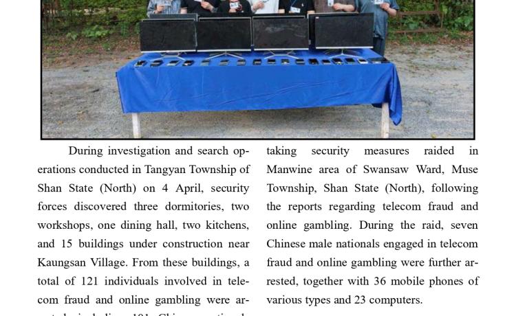 တာချီလိတ်မြို့နယ်၊ ပန်ကူကျေးရွာအနီး၌ အွန်လိုင်းလိမ်လည်လောင်းကစားမှု လုပ်ငန်းများ လုပ်ကိုင်နေသည့် တရားမဝင်ပြည်ပနိုင်ငံသား (၁၂၆) ဦးအား လုပ်ငန်းသုံးဆက်စပ်ပစ္စည်းများနှင့်အတူ ဖမ်းဆီးရမိ