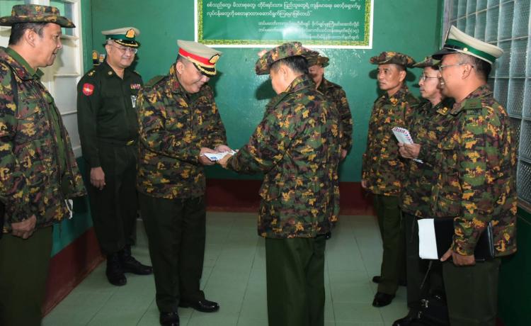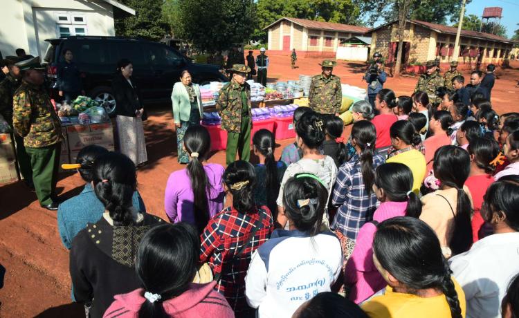 နိုင်ငံတော်စီမံအုပ်ချုပ်ရေးကောင်စီ ဒုတိယဥက္ကဋ္ဌ ဒုတိယတပ်မတော်ကာကွယ်ရေးဦးစီးချုပ်၊ ကာကွယ်ရေးဦးစီးချုပ်(ကြည်း) ဒုတိယဗိုလ်ချုပ်မှူးကြီး စိုးဝင်း လားရှိုးမြို့၊ သီရိမင်္ဂလာမန်ဆူရှမ်းကျောင်းတိုက်တွင် ရောက်ရှိနေသည့် ယာယီနေရပ်စွန့်ခွာ ဒေသခံပြည်သူများအား သွားရောက်တွေ့ဆုံအားပေး