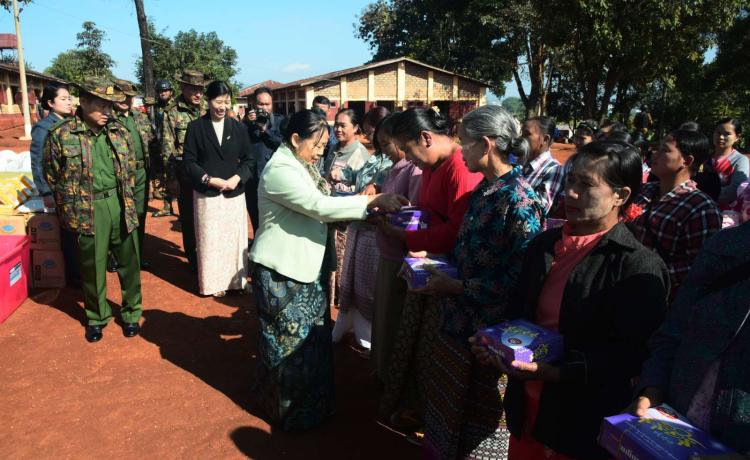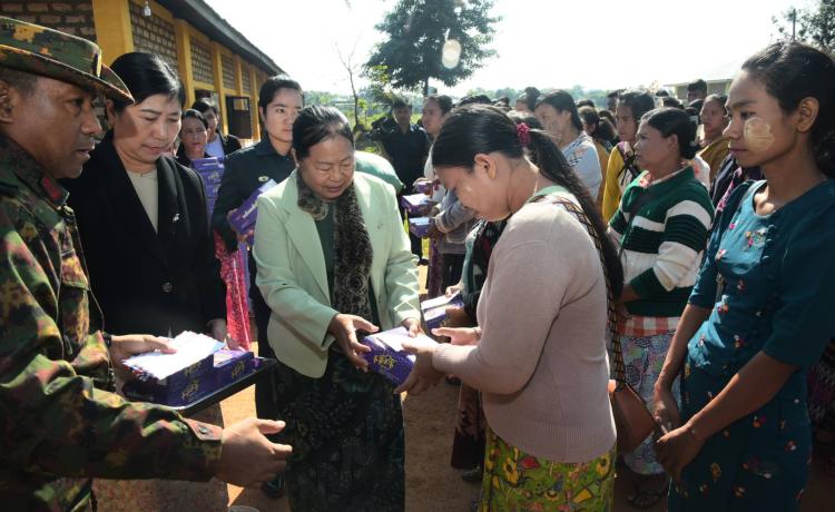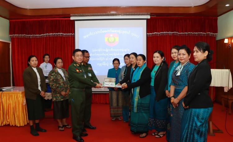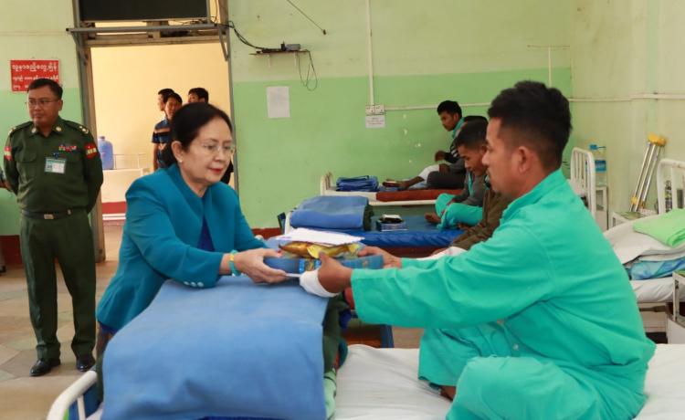 နိုင်ငံတော်ကာကွယ်ရေးတာဝန်ထမ်းဆောင်စဉ် ထိခိုက်ဒဏ်ရာရရှိ၍ ပြင်ဦး လွင်မြို့၊ အမှတ်(၁)တပ်မတော်ဆေးရုံ(ခုတင် ၇၀၀)တွင် တက်ရောက်ကုသနေသော တပ်မတော်သားများအား မြန်မာနိုင်ငံအမျိုးသမီးရေးရာအဖွဲ့ချုပ်မှ အလှူငွေများ၊ စားသောက်ကုန်၊ လူသုံးကုန်များ ချီးမြှင့်ပေးအပ်ခြင်း အခမ်းအနားကို ယနေ့မွန်းလွဲပိုင်း က အဆိုပါဆေးရုံ အစည်းအဝေးခန်းမတွင် ကျင်းပသည်။