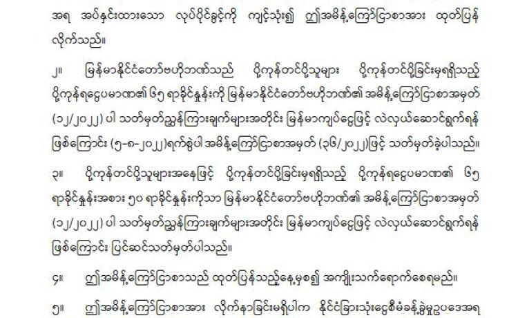 (၅၆)ကြိမ်မြောက်အာဆီယံနိုင်ငံခြားရေးဝန်ကြီးများအစည်းအဝေးတွင်ထုတ်ပြန်ခဲ့သည့်ပူးတွဲကြေညာချက်တွင်မြန်မာနိုင်ငံကိစ္စနှင့်ပတ်သက်၍ ဖော်ပြချက်အချို့သည် အာဆီယံပဋိညာဉ်ပါမူကြီးများနှင့် ကိုက်ညီခြင်းမရှိအတွက် မြန်မာနိုင်ငံအနေဖြင့်လက်မခံကန့်ကွက်