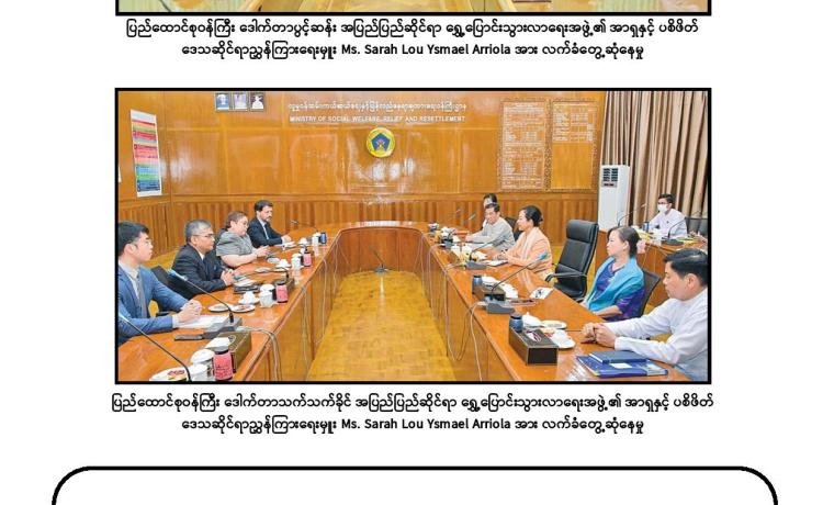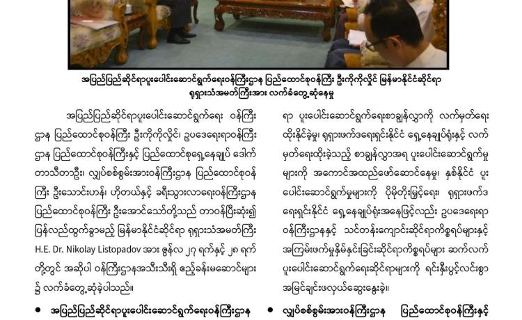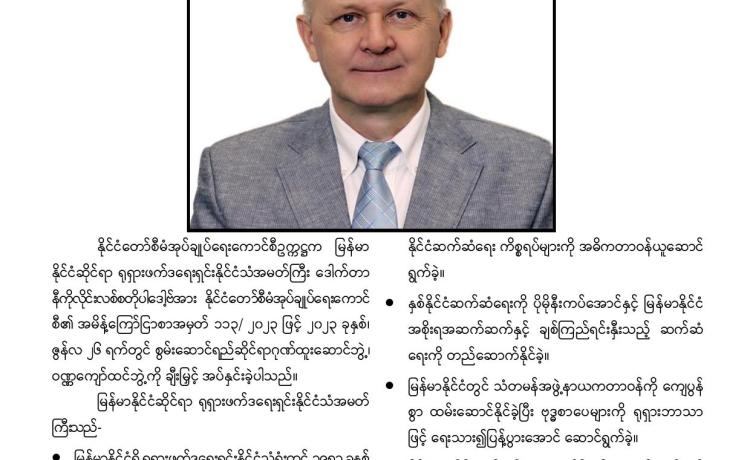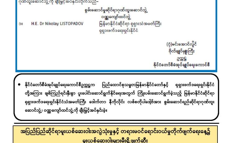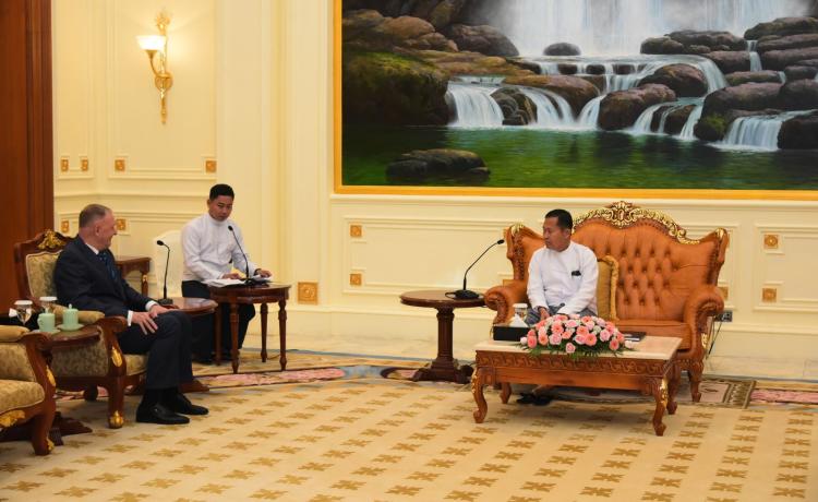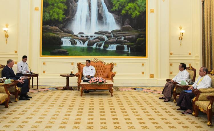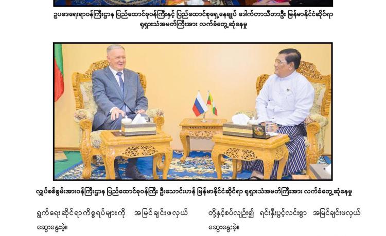 နိုင်ငံတော်စီမံအုပ်ချုပ်ရေးကောင်စီ ဒုတိယဥက္ကဋ္ဌ ဒုတိယဝန်ကြီးချုပ် ဒုတိယဗိုလ်ချုပ် မှူးကြီး စိုးဝင်း သည် တာဝန်ပြီးဆုံး၍ ပြန်လည်ထွက်ခွာမည့် မြန်မာနိုင်ငံဆိုင်ရာ ရုရှားဖက်ဒရေးရှင်းနိုင်ငံ သံအမတ်ကြီး H. E. Dr. Nikolay Listopadov အား ယနေ့ မွန်းလွဲပိုင်းတွင် နေပြည်တော်ရှိ နိုင်ငံတော်စီမံအုပ်ချုပ်ရေးကောင်စီဥက္ကဋ္ဌရုံး သံတမန်ဆောင် ဧည့်ခန်းမ၌ လက်ခံတွေ့ဆုံသည်။