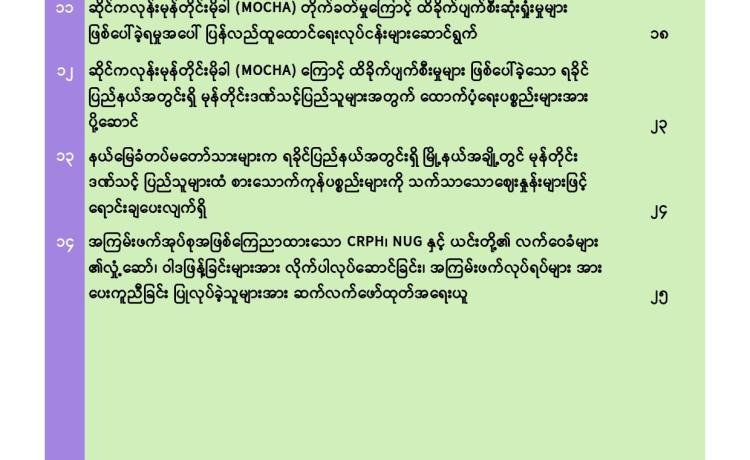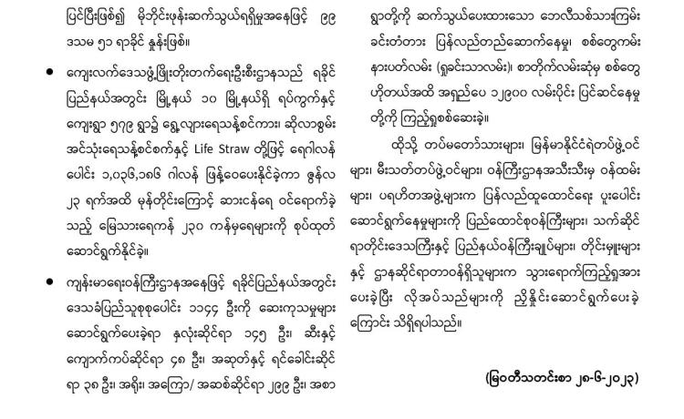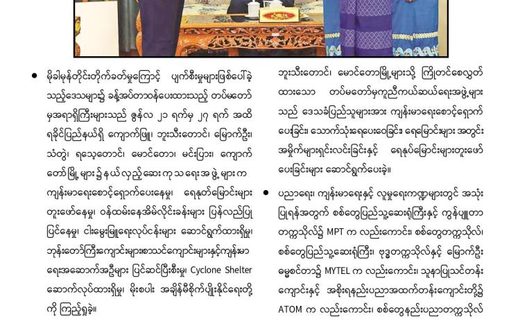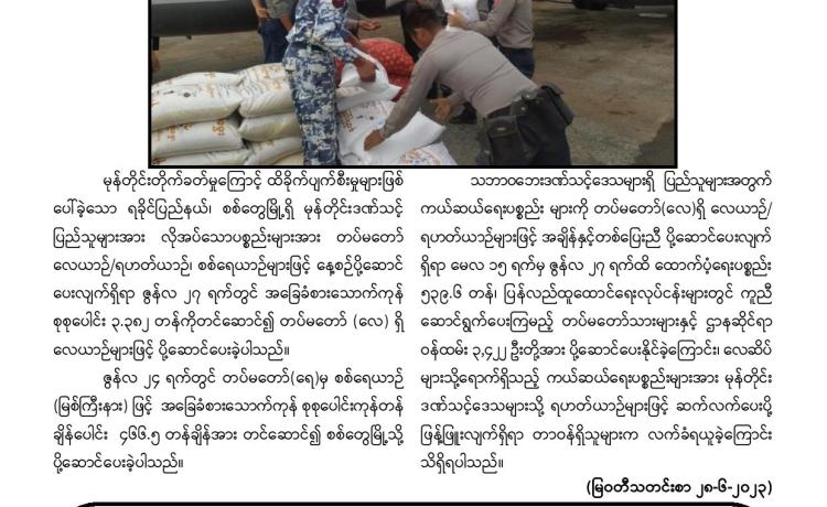 သဘာဝဘေးအန္တရာယ်ကျရောက်ခဲ့ရသည့် ဒေသများတွင် လိုအပ်သည့် ကူညီ ကယ်ဆယ်ရေးနှင့် ပြန်လည်ထူထောင်ရေးလုပ်ငန်းများ ကူညီဆောင်ရွက်ပေးနိုင်ရေး အတွက် တပ်မတော်မှ ကြိုတင်စုဖွဲ့စေလွှတ်ထားသည့် ကူညီကယ်ဆယ်ရေးအဖွဲ့များ သည် နယ်မြေခံ လုံခြုံရေးတပ်ဖွဲ့ဝင်များ၊ လူမှုကယ်ဆယ်ရေးအဖွဲ့များနှင့် ပူးပေါင်း၍ သက်ဆိုင်ရာဒေသများတွင် အင်တိုက်အားတိုက် ကူညီဆောင်ရွက်ပေးလျက်ရှိသည်။