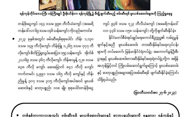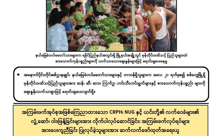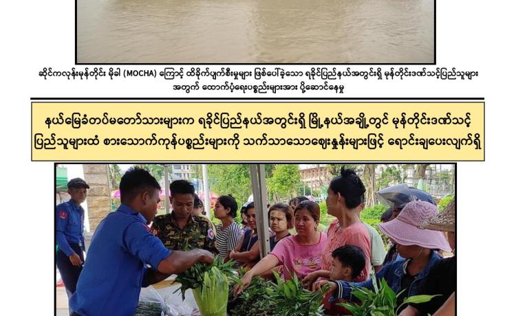 ဆိုင်ကလုန်းမုန်တိုင်း(မိုခါ)တိုက်ခတ်မှုကြောင့် ပျက်စီးမှုများ ဖြစ်ပေါ်ခဲ့သည့် စစ်တွေမြို့ရှိ မုန်တိုင်းဒဏ်သင့် ဒေသခံပြည်သူများနှင့် ဌာနဆိုင်ရာဝန်ထမ်းများ၏ စားသောက်ရေး အဆင်ပြေစေရန်နှင့် မိမိတို့အလိုရှိရာ စားသောက်ကုန်ပစ္စည်းများကို ဈေးနှုန်းသက်သာစွာဖြင့် ဝယ်ယူစားသောက်နိုင်ရေးအတွက် အနောက်ပိုင်းတိုင်း စစ်ဌာနချုပ်၊ နယ်မြေခံတပ်မတော်သားများနှင့် တာဝန်ရှိသူများက နေ့စဉ်ရောင်းချပေး လျက်ရှိသည်။