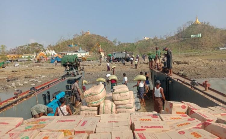 ဆိုင်ကလုန်းမုန်တိုင်း မိုခါ(MOCHA) ဖြတ်သန်းတိုက်ခတ်မှုကြောင့် ထိခိုက် ပျက်စီးဆုံးရှုံးမှုများဖြစ်ပေါ်ခဲ့သော ရခိုင်ပြည်နယ်၊ စစ်တွေမြို့ရှိ မုန်တိုင်းဒဏ်သင့် ပြည်သူများအား လိုအပ်သောပစ္စည်းများ ကူညီထောက်ပံ့မှုများ ဆောင်ရွက် ပေးနိုင်ရန် တပ်မတော်(ရေ)မှ ၂၉ မီတာကမ်းထိုးရေ ယာဉ်ပထမအစီးသည် ရေတုန်ကင် ၇၀ လုံး၊ ကျောင်းစိမ်းဝတ်စုံအထုပ်ကြီး ၁၃ ထုပ်၊ ထောက်ပံ့ပစည်းစုံ ၃၆ ထုပ်၊ ရေသန့်ဆေးပြား ၁၉၈ ဖာ၊ ၅၂ ဂါလံ(ဒီဇယ်) ပေပါ ၇၀ လုံး၊ ကယ်ဆယ်ရေး ကော်ပုံးကြီး ၂၄ ပုံး၊ မိုးကာစ ၂၄ ထုပ်၊ မိုးကာတဲငုတ်များ၊ အခြေခံလူသုံးကုန် ပစ္စည်းများ စုစုပေါင်းကုန်တန်ချိန် ၂၄ တန်တို့အား ရေချမ်းပြင်ကမ်းထိုးရပ်၌ တင်ဆောင်၍ ရသေ့တောင်နှင့် ဘူးသီးတောင် ကမ်းထိုးရပ် များသို့လည်းကောင်း၊ ၂၉ မီတာ ကမ်းထိုးရေယာဉ်ဒုတိယအစီးသည် MV.Sunshine ရေယာဉ်မှ သွား တိုက်တံ ၂၃၀၀ ချောင်း၊ သွားတိုက်ဆေး(၂၅)ဂရမ် ၆,၀၀၀ ဘူး၊ သွားတိုက်ဆေး (၇၅)ဂရမ် ၆,၀၀၀ ဘူး၊ ၂၀ လီတာရေသန့်ဘူးခွံ ၅၀ လုံး၊ MV.Forture ရေယာဉ်မှ သွပ် ၅,၀၀၀ ချပ်၊ သွပ်သံ ၂၁၆ ဖာ၊ မိုးကာတဲ ၂၀ ခု၊ ဆန် ၁၅၀ အိတ်၊ ဆီ ၂၂၅ ပိဿာ၊ ဆား ၄၅ ပိဿာ၊ ပဲ ၄၅၀ ပိဿာ၊ ခေါက်ဆွဲခြောက် ၆၀၀ ဖာ၊ ရေသန့် ၆၅၀ ကဒ်၊ အဝတ်အထည် အထုပ်ကြီး ၁၀ ထုပ်နှင့် အိန္ဒိယနိုင်ငံမှထောက်ပံ့သည့် တာပေါ်လင် ၅၂ လိတ် စုစုပေါင်း ကုန်တန်ချိန်(၅၇)တန်တို့အား တင်ဆောင်၍ စစ်တွေမှ ပုဏ္ဏား ကျွန်းကမ်းထိုးရပ်သို့လည်းကောင်း ယနေ့နံနက်ပိုင်းတွင် ပို့ဆောင်ပေးသည်။