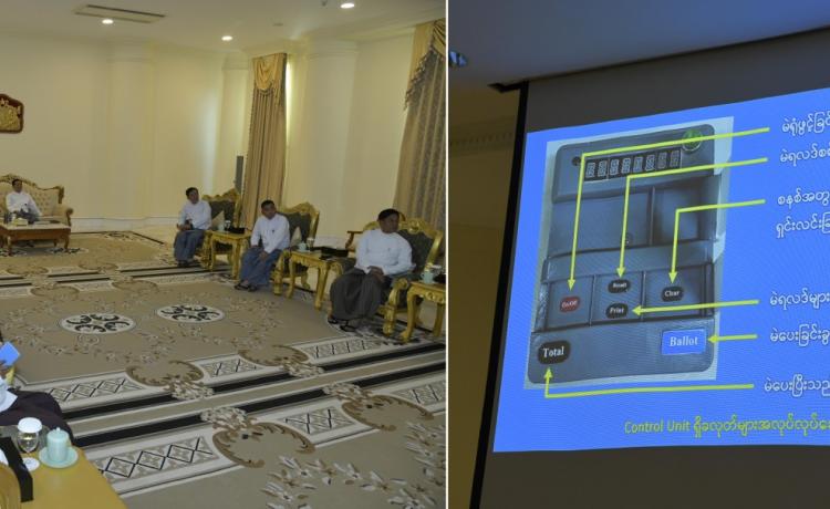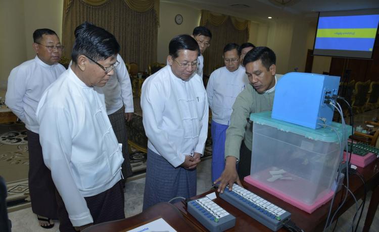 နိုင်ငံတော်စီမံအုပ်ချုပ်ရေးကောင်စီ ဥက္ကဋ္ဌ နိုင်ငံတော်ဝန်ကြီးချုပ် ဗိုလ်ချုပ်မှူးကြီး မင်းအောင်လှိုင် ထံ ပြည်ထောင်စုရွေးကောက်ပွဲကော်မရှင်မှ Myanmar Electronic Voting Maching (MEVM) တည်ဆောက်ထားရှိမှုနှင့်ပတ်သက်၍ ရှင်းလင်းတင်ပြခြင်း ကို ယနေ့ညနေပိုင်းတွင် နေပြည်တော်ရှိ နိုင်ငံတော်စီမံအုပ်ချုပ်ရေးကောင်စီဥက္ကဋ္ဌရုံး အစည်းအဝေးခန်းမ၌ ပြုလုပ်ရာ နိုင်ငံတော်စီမံအုပ်ချုပ်ရေးကောင်စီဒုတိယဥက္ကဋ္ဌ ဒုတိယဝန်ကြီးချုပ် ဒုတိယဗိုလ်ချုပ်မှူးကြီး စိုးဝင်း၊ ကောင်စီအတွင်းရေးမှူး ဒုတိယ ဗိုလ်ချုပ်ကြီး အောင်လင်းဒွေး၊ တွဲဖက်အတွင်းရေးမှူး ဒုတိယဗိုလ်ချုပ်ကြီး ရဲဝင်းဦး၊ ကောင်စီဝင်များ ဖြစ်ကြသည့် ဗိုလ်ချုပ်ကြီး မြထွန်းဦး၊ ဗိုလ်ချုပ်ကြီး တင်အောင်စန်း၊ ဒုတိယဗိုလ်ချုပ်ကြီး စိုးထွဋ်၊ ပြည်ထောင်စု ရွေးကောက်ပွဲကော်မရှင်ဥက္ကဋ္ဌ ဦးသိန်းစိုး နှင့် တာဝန်ရှိသူများ တက်ရောက်ကြသည်။