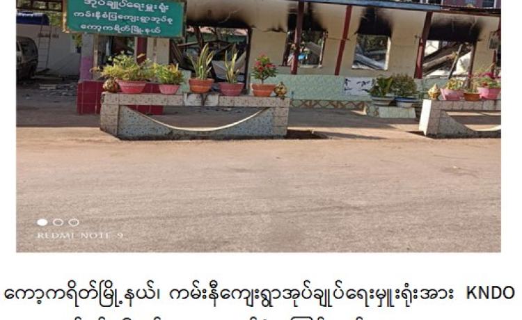 ကရင်ပြည်နယ်၊ ကော့ကရိတ်မြို့နယ်၊ ကမ်းနီကျေးရွာရှိ ကျေးရွာအုပ်ချုပ်ရေးမှူးရုံးအား KNDO တပ်ရင်း(၆)မှ အကြမ်းဖက်မှုကိုလိုလားသည့်အဖွဲ့နှင့် PDF အမည်ခံအကြမ်းဖက်သမား များက ယနေ့နံနက်အစောပိုင်းတွင် အကြောင်းမဲ့လာရောက် မီးရှို့ဖျက်ဆီးခဲ့ကြောင်း သိရှိရသည်။