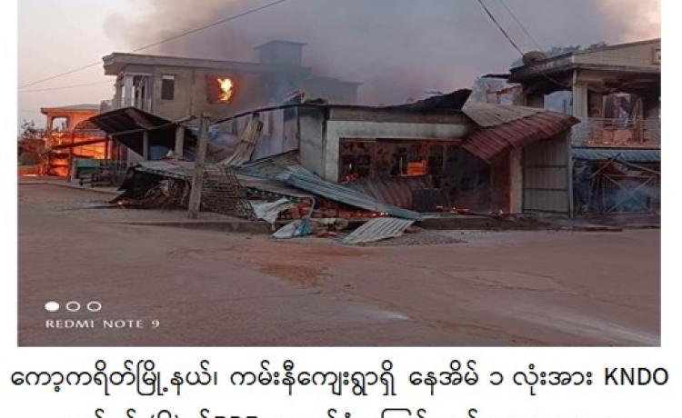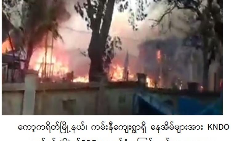 ကရင်ပြည်နယ်၊ ကော့ကရိတ်မြို့နယ်၊ ကမ်းနီကျေးရွာရှိ နေအိမ် ၁ လုံးအား KNDO တပ်ရင်း(၆)မှ အကြမ်းဖက်မှုကိုလိုလားသည့်အဖွဲ့နှင့် PDF အမည်ခံအကြမ်းဖက်သမားများက ဇန်နဝါရီ ၂၄ ရက်တွင် အကြောင်းမဲ့လာရောက် မီးရှို့ဖျက်ဆီးပြီး ကျေးရွာအုပ်ချုပ်ရေးမှူးအား ဖမ်းဆီးခေါ်ဆောင်သွားခဲ့ကြောင်း သိရှိရသည်။
