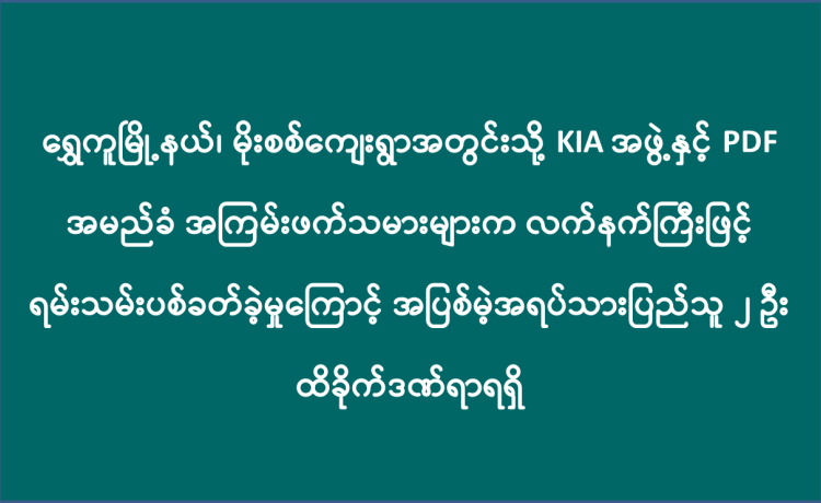 ကချင်ပြည်နယ်၊ ရွှေကူမြို့နယ်၌ မိုးစစ်ကျေးရွာအတွင်းသို့ KIA အဖွဲ့နှင့် PDF အမည်ခံ အကြမ်းဖက်သမားများက လက်နက်ကြီးဖြင့် ရမ်းသမ်းပစ်ခတ်ခဲ့မှုကြောင့် အပြစ်မဲ့အရပ်သား ပြည်သူ ၂ ဦး ထိခိုက်ဒဏ်ရာရရှိခဲ့သည်။