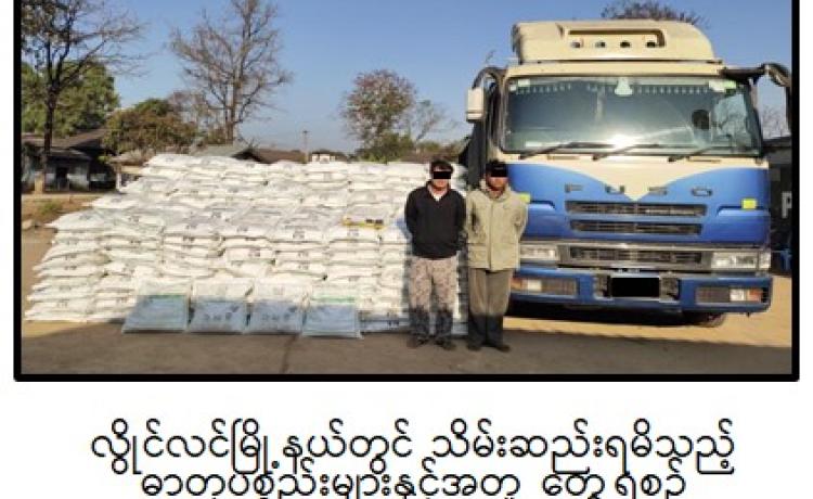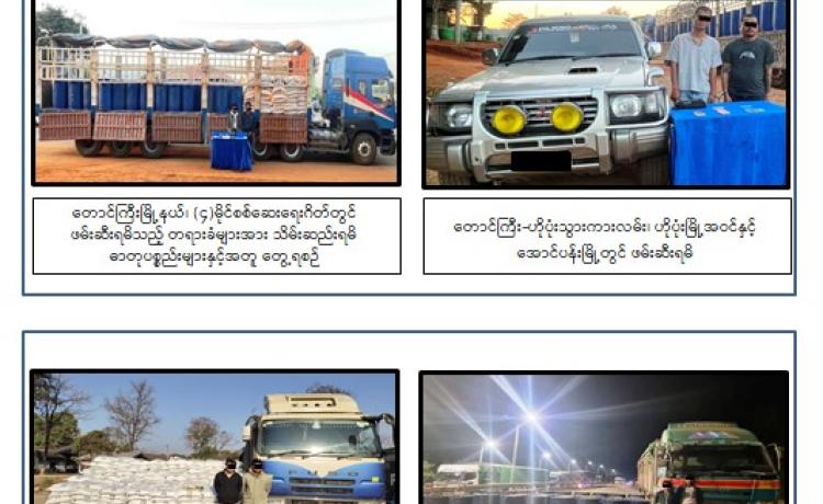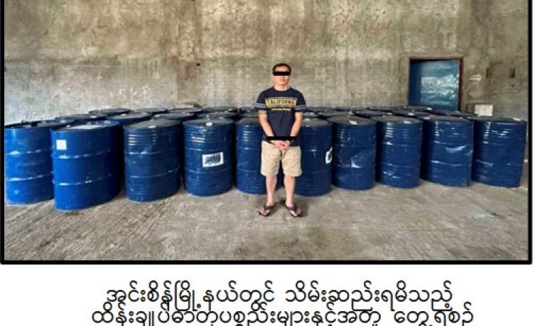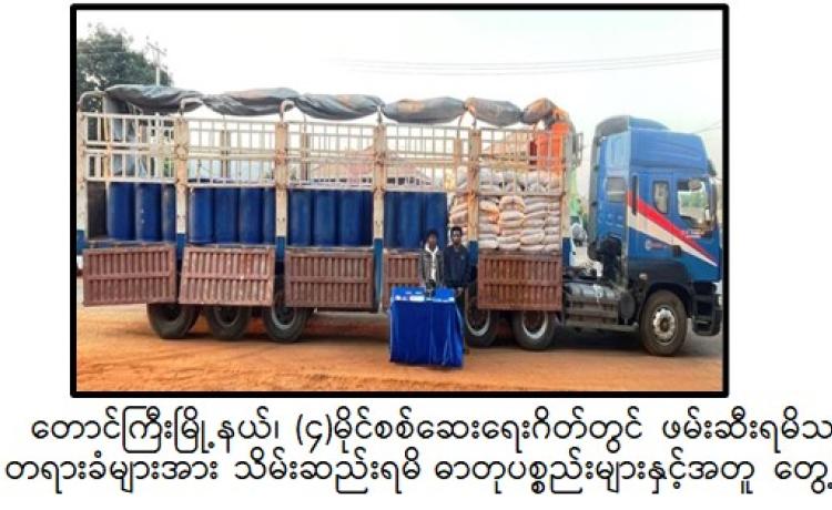 ရွှေတြိဂံဒေသအတွင်းသို့ ဓာတုပစ္စည်းများ နည်းမျိုးစုံဖြင့်ဝင်ရောက်၍ မူးယစ်ဆေးဝါး ထုတ်လုပ်သယ်ဆောင်ရောင်းဝယ်မှုများမရှိစေရေးအတွက် မြန်မာ-လာအို-ထိုင်း ၃ နိုင်ငံပူးပေါင်း၍ တရားမဝင်သယ်ဆောင်ရောင်းဝယ်မှု၊ တရားဝင်သယ်ဆောင်ရောင်းဝယ်ခွင့်ရယူပြီး မူးယစ်ဆေးဝါး ထုတ်လုပ်ရာနယ်ပယ်များသို့ တရားမဝင်သယ်ဆောင်မှုတို့ ထိန်းချုပ်ရေးကို အရှိန်အဟုန်မြှင့် ဆောင်ရွက်လျက်ရှိရာ မူးယစ်ဆေးဝါးတားဆီးနှိမ်နင်းရေးရဲတပ်ဖွဲ့မှ တပ်ဖွဲ့ဝင်များပါဝင်သော ပူးပေါင်းအဖွဲ့သည် ဇန်နဝါရီလ ၁၄ ရက်နေ့ နံနက် ၇ နာရီခွဲအချိန် ရှမ်းပြည်နယ်(တောင်ပိုင်း)၊ တောင်ကြီးမြို့နယ်၊ တောင်ကြီး-လွိုင်လင်သွားကားလမ်း၊ (၄)မိုင်ပူးပေါင်းစစ်ဆေးရေးဂိတ်တွင် တောင်ကြီးမှ လွိုင်လင်ဘက်သို့ ဇော်ဌေးအောင် မောင်းနှင်ပြီး အာကာ လိုက်ပါလာသည့် ၂၂ ဘီး တွဲယာဉ်ကို သတင်းအရရှာဖွေရာ ယာဉ်ပေါ်တွင် အချိုရည်ကတ်များဖြင့်ဖုံးအုပ်၍ တရားမဝင် သယ်ဆောင်လာသော သံပီပါ(၈၀)လုံးဖြင့်ထည့်လျက် ဓာတုပစ္စည်း Sulfurous Dichloride ၁၂ တန် သိမ်းဆည်းရမိခဲ့ကြောင်း၊