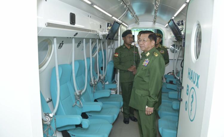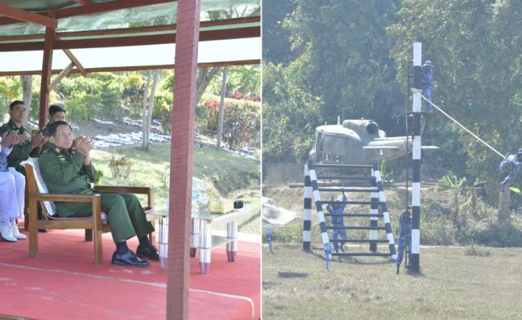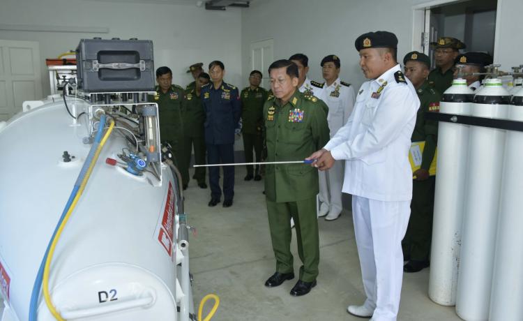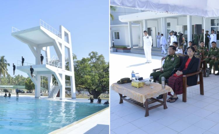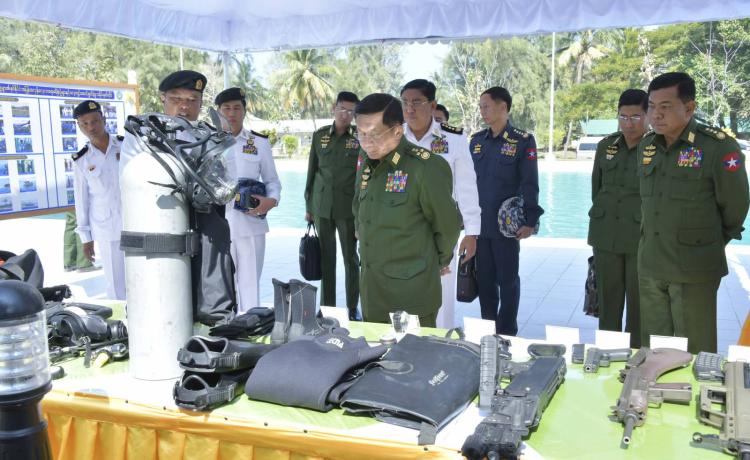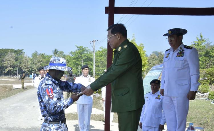 နိုင်ငံတော်စီမံအုပ်ချုပ်ရေးကောင်စီဥက္ကဋ္ဌ တပ်မတော်ကာကွယ် ရေးဦးစီးချုပ် ဗိုလ်ချုပ်မှူးကြီး မင်းအောင်လှိုင် ရခိုင်ပြည်နယ်၊ သံတွဲမြို့အနီးရှိ နယ်မြေခံရေတပ်ပင်မရေငုပ်နှင့် ဆယ်ယူရေးတပ်၏ လေ့ကျင့်ရေးဆောင်ရွက်နေမှုများအား သွားရောက်ကြည့်ရှုစစ်ဆေး