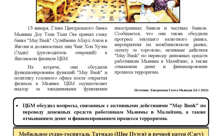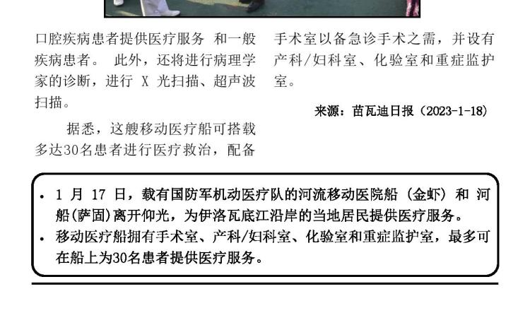 ဧရာဝတီတိုင်းဒေသကြီး၊ ဧရာဝတီမြစ်ကြောင်းတစ်လျှောက်ရှိ မြစ်ဝကျွန်းပေါ် ကျေးရွာများမှ ဒေသခံပြည်သူများအား ကျန်းမာရေးစောင့်ရှောက်မှုလုပ်ငန်းများ ဆောင်ရွက်ပေးရန်ရောက်ရှိနေသော တပ်မတော်နယ်လှည့်အထူးကုဆေးအဖွဲ့မှ ပါရဂူ များ၊ ဆေးမှူးများနှင့် သူနာပြုများပါဝင်သော တပ်မတော်မြစ်တွင်းသွား ဆေးရုံ ရေယာဉ်(ရွှေပုဇွန်)နှင့် မြစ်ရေယာဉ်(စကု)တို့သည့် ယနေ့တွင် ညောင်တုန်းမြို့နယ်၊ ဆားမလောက်ကျေးရွာနှင့် ပတ်ဝန်းကျင်ကျေးရွာများမှ ဒေသခံပြည်သူ ၂၃၁ ဦးအား ၎င်းကျေးရွာ၌ ကျန်းမာရေးစောင့်ရှောက်မှုလုပ်ငန်းများ စတင်ဆောင်ရွက်ပေးသည်။