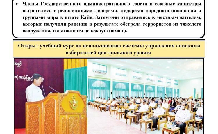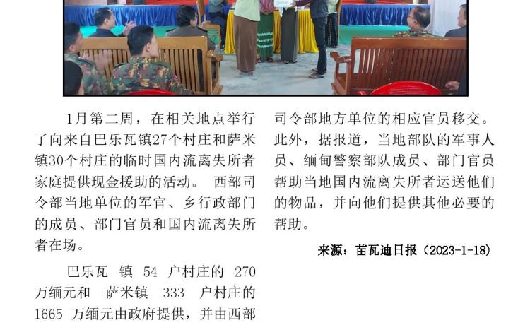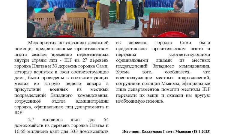 နိုင်ငံတော်စီမံအုပ်ချုပ်ရေးကောင်စီဥက္ကဋ္ဌ တပ်မတော်ကာကွယ်ရေးဦးစီးချုပ် ဗိုလ်ချုပ်မှူးကြီး မင်းအောင်လှိုင် သည် ဇနီး ဒေါ်ကြူကြူလှ၊ ညှိနှိုင်းကွပ်ကဲရေးမှူး (ကြည်း၊ ရေ၊ လေ) ဗိုလ်ချုပ်ကြီး မောင်မောင်အေးနှင့်ဇနီး၊ ကာကွယ်ရေးဦးစီးချုပ်(ရေ) ဗိုလ်ချုပ်ကြီး မိုးအောင်နှင့် ဇနီး၊ ကာကွယ်ရေးဦးစီးချုပ်(လေ) ဗိုလ်ချုပ်ကြီး ထွန်းအောင် နှင့် ဇနီး၊ ကာကွယ်ရေးဦးစီးချုပ်ရုံးမှ တပ်မတော်အရာရှိကြီးများနှင့် ဇနီးများ၊ အနောက်ပိုင်းတိုင်းစစ်ဌာနချုပ်တိုင်းမှူး ဗိုလ်ချုပ် ထင်လတ်ဦးနှင့် တာဝန်ရှိသူများ လိုက်ပါ၍ ရခိုင်ပြည်နယ်၊ သံတွဲမြို့အနီးရှိ နယ်မြေခံပင်မရေငုပ်နှင့် ဆယ်ယူရေးတပ်၏ လေ့ကျင့်ရေး ဆောင်ရွက်နေမှုများနှင့် တပ်တည်ဆောက်ရေးလုပ်ငန်းများ အကောင် အထည်ဖော် ဆောင်ရွက်နေမှုများကို သွားရောက် ကြည့်ရှုစစ်ဆေးသည်။