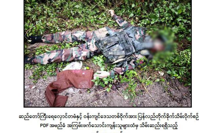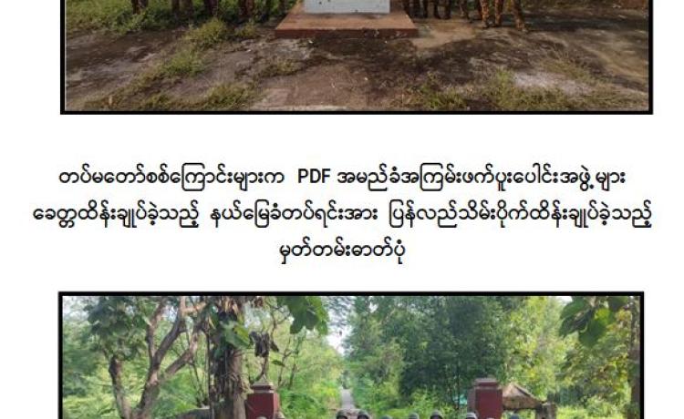 အကြမ်းဖက်သမားများအနေဖြင့် နိုင်ငံတော်တည်ငြိမ်ရေးနှင့် တရားဉပဒေ စိုးမိုးရေးလုပ်ငန်းများကို အနှောင့်အယှက်ဖြစ်စေရန်၊ အရပ်သားပြည်သူများအား ကြောက်ရွံ့ထိတ်လန့်မှုများ ဖြစ်ပေါ်စေရန်အတွက် အကြမ်းဖက်မှုလုပ်ရပ်များကို နည်းလမ်းပေါင်းစုံဖြင့် လုပ်ဆောင်လျက်ရှိကြရာ နိုဝင်ဘာ ၆ ရက် နံနက်ပိုင်းတွင် မကွေးတိုင်းဒေသကြီး၊ သရက်မြို့ရှိ သရက်-ကံမကားလမ်းအတိုင်း အရပ်သားပြည်သူ များ မောင်းနှင်လာသည့် မော်တော်ယာဉ်အား PDF အမည်ခံ အကြမ်းဖက်သမားများက မိုင်းဆွဲတိုက်ခိုက်ခဲ့သဖြင့် မော်တော်ယာဉ်ပေါ်ရှိ အပြစ်မဲ့ပြည်သူ အမျိုးသား ၂ ဦး မီးလောင်သေဆုံးခဲ့ကြောင်း သိရှိရသည်။