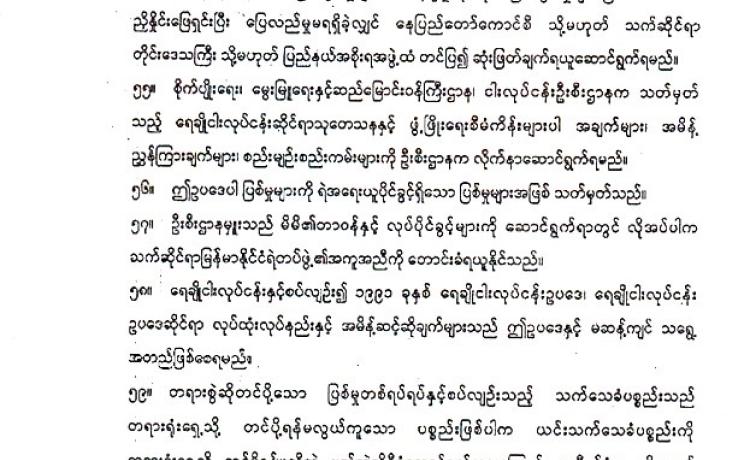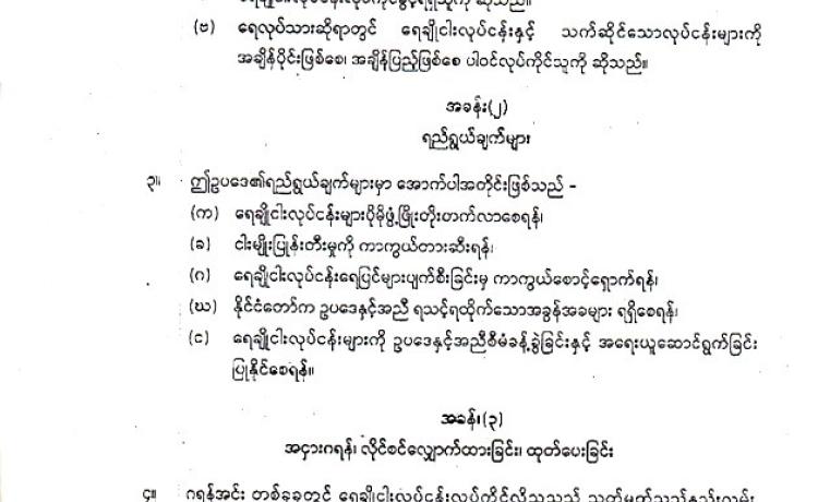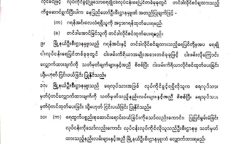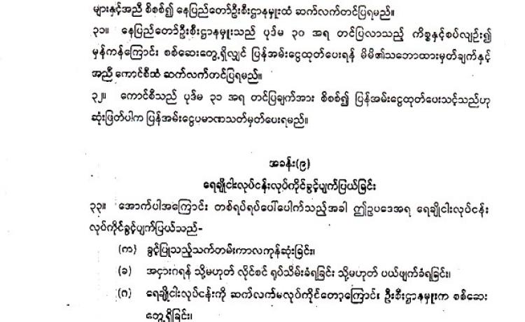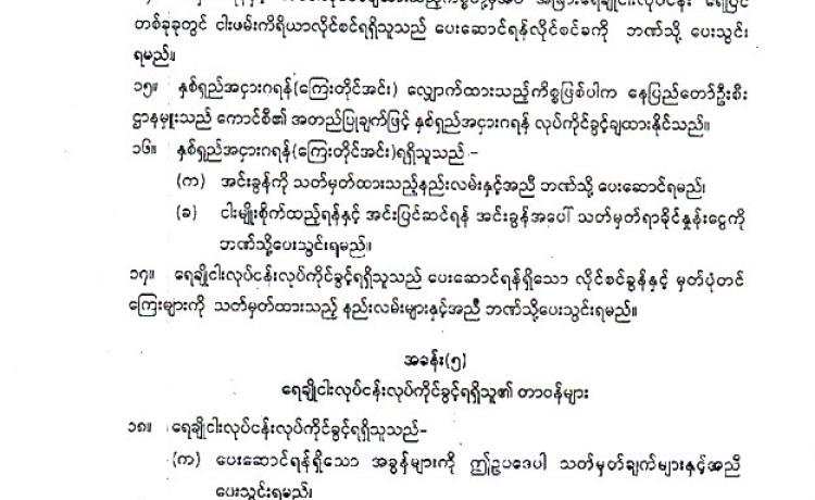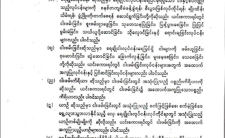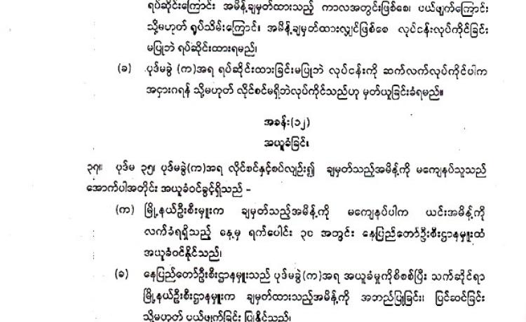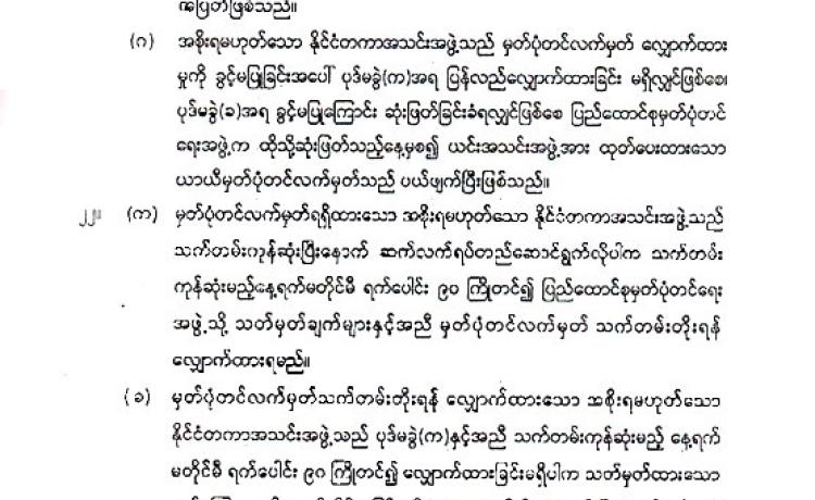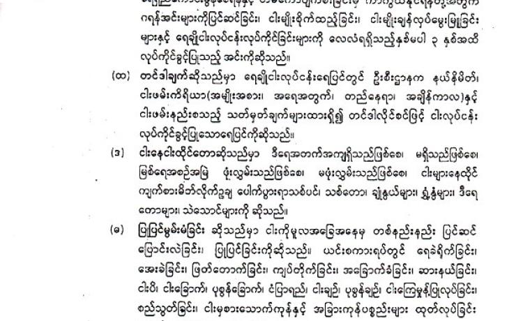 “(ခ) ဝန်ကြီးဌာန၊ သက်ဆိုင်ရာ ဝန်ကြီးဌာနများနှင့် ၎င်းတို့၏ သက်ဆိုင်ရာ ဦးစီးဌာနများသည် အမိန့်ကြော်ငြာစာ၊ အမိန့်၊ ညွှန်ကြားချက်နှင့် လုပ်ထုံး လုပ်နည်းများကို ထုတ်ပြန်နိုင်သည်။”