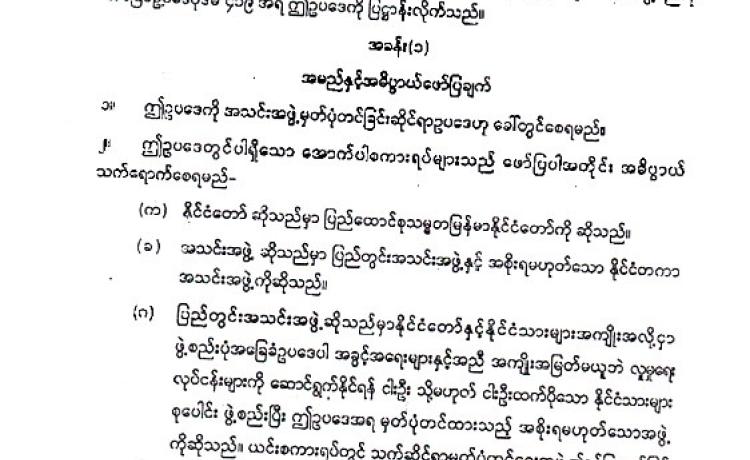 နိုင်ငံတော်စီမံအုပ်ချုပ်ရေးကောင်စီသည် ပြည်ထောင်စုသမ္မတမြန်မာနိုင်ငံတော် ဖွဲ့စည်းပုံ အခြေခံဥပဒေပုဒ်မ ၄၁၉ အရ ဤဥပဒေကို ပြဋ္ဌာန်းလိုက်သည်။