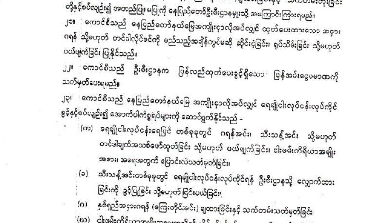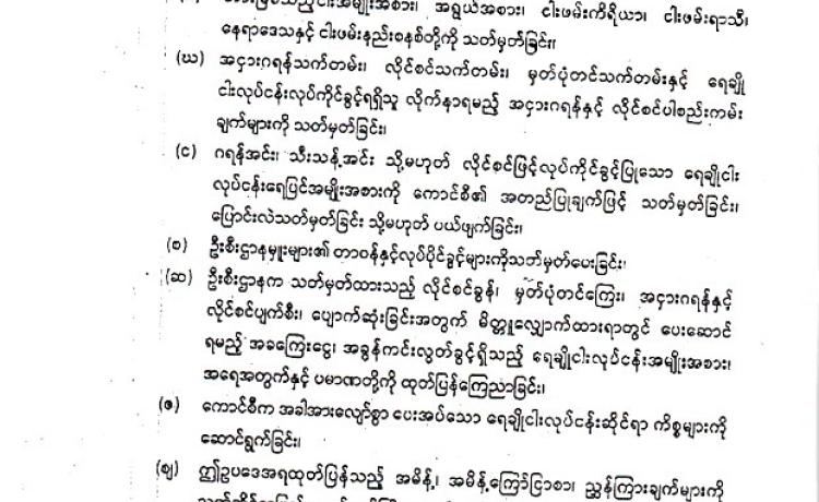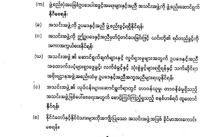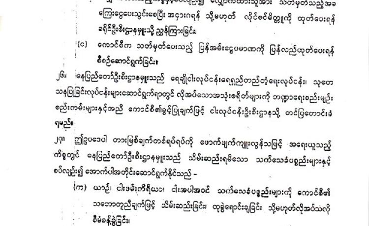 “(ဂ) ဝန်ကြီးဌာနနှင့် သက်ဆိုင်ရာ ဝန်ကြီးဌာနများက ဖွဲ့စည်းထားသည့် ကော်မတီ၊ ကောင်စီ နှင့် အဖွဲ့များသည် အမိန့်ကြော်ငြာစာနှင့် ညွှန်ကြားချက်များကို ထုတ်ပြန်နိုင်သည်။”
