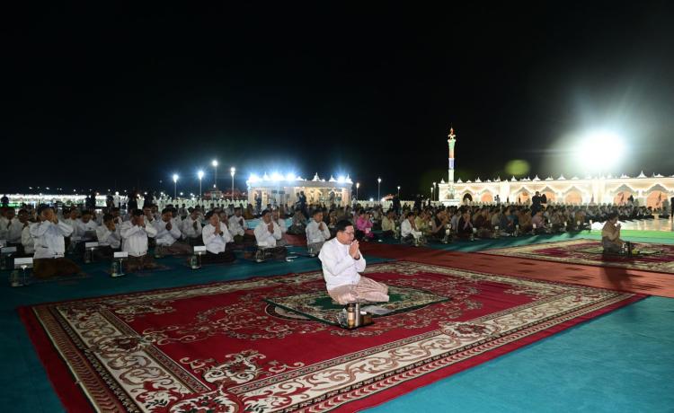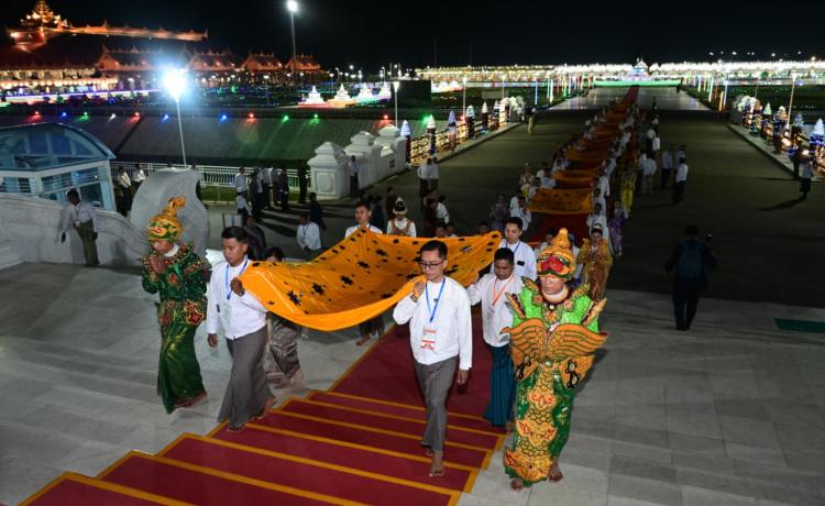 ပြည်ထောင်စုသမ္မတမြန်မာနိုင်ငံတော်ယာယီသမ္မတ နိုင်ငံတော်လုံခြုံရေးနှင့် အေးချမ်းသာယာရေးကော်မရှင်ဥက္ကဋ္ဌ ဗိုလ်ချုပ်မှူးကြီး မင်းအောင်လှိုင်နှင့် ဇနီး ဒေါ်ကြူကြူလှ ၂၀၂၅ ခုနှစ်၊ မာရဝိဇယဗုဒ္ဓရုပ်ပွားတော်မြတ်ကြီး တန်ဆောင်တိုင်ပွဲတော် မသိုးရွှေကြာသင်္ကန်း ရက်လုပ်ပူဇော်ပွဲဖွင့်ပွဲအခမ်းအနားသို့ တက်ရောက်ကြည်ညို