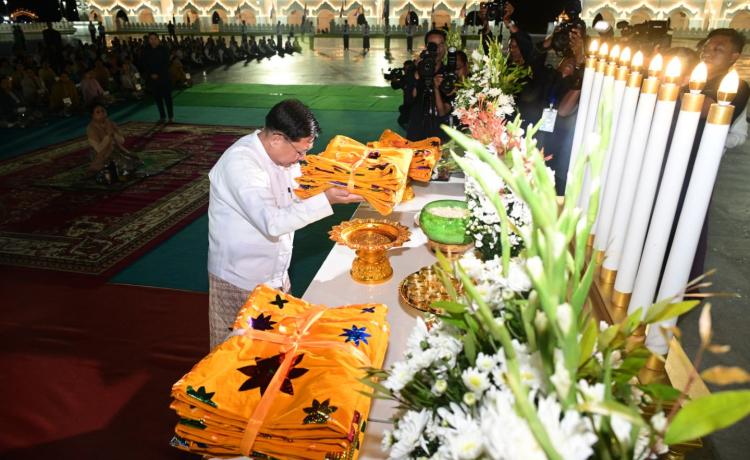 မာရဝိဇယဗုဒ္ဓရုပ်ပွားတော်မြတ်ကြီးအား ၂၀၂၅ ခုနှစ်၊ တန်ဆောင်တိုင်ပွဲတော် မသိုး ရွှေကြာသင်္ကန်း ဆက်ကပ်လှူဒါန်းခြင်း မဟာမင်္ဂလာအခမ်းအနားကို ယနေ့နံနက် မင်္ဂလာ အချိန်တွင် ကျင်းပပြုလုပ်ရာ ပြည်ထောင်စုသမ္မတမြန်မာနိုင်ငံတော် ယာယီသမ္မတနိုင်ငံတော် လုံခြုံရေးနှင့်အေးချမ်းသာယာရေးကော်မရှင်ဥက္ကဋ္ဌ ဗိုလ်ချုပ်မှူးကြီး မင်းအောင်လှိုင် တက် ရောက်၍ မသိုးရွှေကြာသင်္ကန်းဆက်ကပ်လှူဒါန်းသည်။
