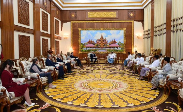 ပြည်ထောင်စုသမ္မတမြန်မာနိုင်ငံတော် ယာယီသမ္မတ နိုင်ငံတော်လုံခြုံရေးနှင့်အေးချမ်းသာယာရေးကော်မရှင်ဥက္ကဋ္ဌ ဗိုလ်ချုပ်မှူးကြီး မင်းအောင်လှိုင် ထံသို့ ရုရှားဖက်ဒရေးရှင်းနိုင်ငံ၊ နိုဗိုစီဗစ်ဒေသအုပ်ချုပ်ရေးမှူး H.E.Mr. Andrey Aleksandrovich Travnikov ဦးဆောင်သောကိုယ်စားလှယ်အဖွဲ့က လာရောက်ဂါရဝပြုတွေ့ဆုံ နေပြည်တော်၊ နိုဝင်ဘာ - ၄