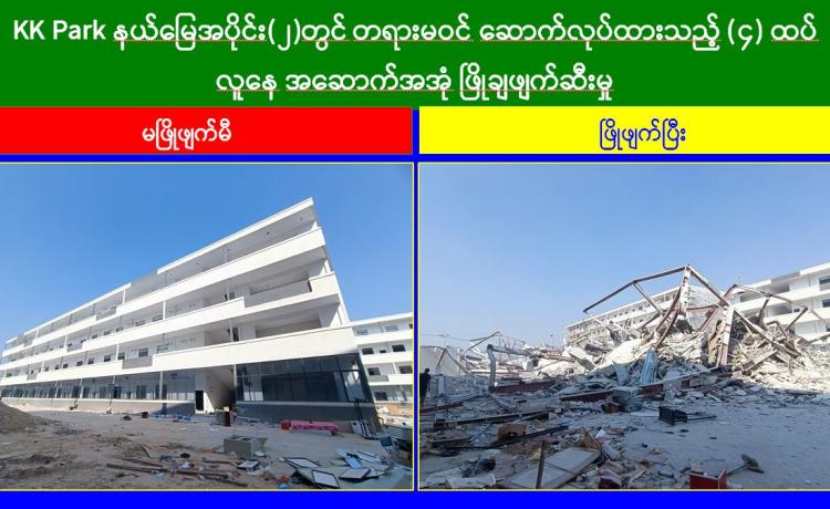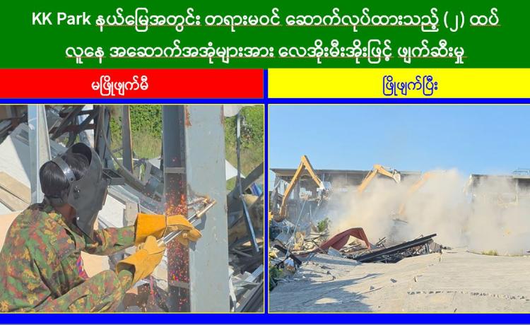 မြန်မာနိုင်ငံအစိုးရအနေဖြင့် အွန်လိုင်းလိမ်လည်လောင်းကစားမှုများ အများဆုံး အခြေချလုပ်ကိုင်လျက်ရှိကြသည့် ရွှေကုက္ကိုလ်နယ်မြေနှင့် KK Park နယ်မြေများရှိ တရားမဝင် အဆောက်အအုံများအတွင်း ဝင်ရောက်ရှင်းလင်း၍ အွန်လိုင်းလိမ်လည် လောင်းကစားမှုလုပ်ငန်းစဉ်များတွင် အသုံးပြုခဲ့သည့် သိမ်းဆည်းရမိပစ္စည်းများနှင့် တရား မဝင် အဆောက်အအုံများအား စနစ်တကျဖြိုချဖျက်ဆီးခြင်းများကို အဖွဲ့စုံပါဝင်သည့် ပူးပေါင်းအဖွဲ့ဖြင့် ဆောင်ရွက်လျက်ရှိရာ ယနေ့တွင်လည်း KK Park နယ်မြေအတွင်းရှိ တရားမဝင်အဆောက်အအုံ ၁၁ လုံးကို