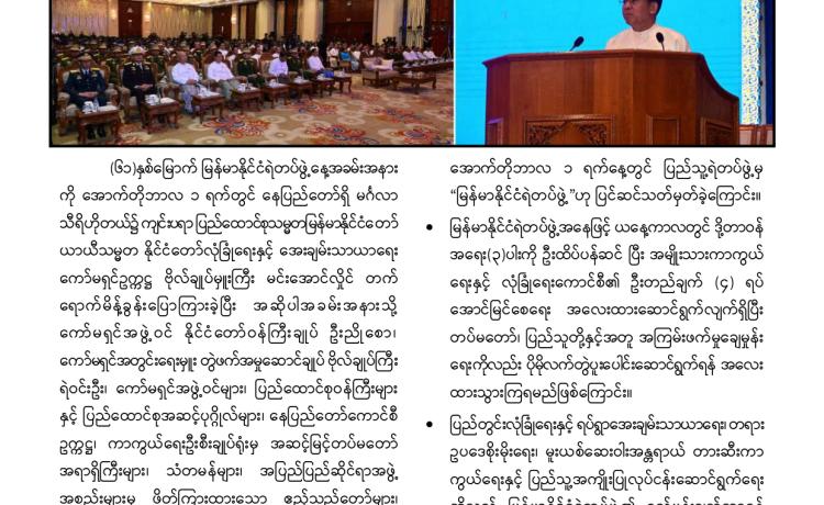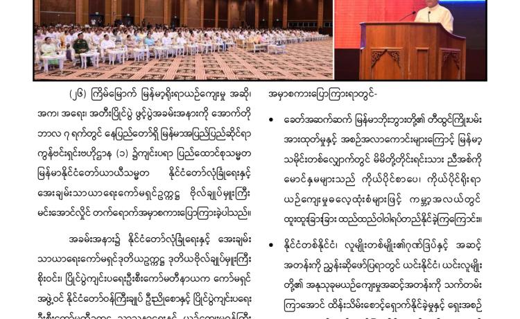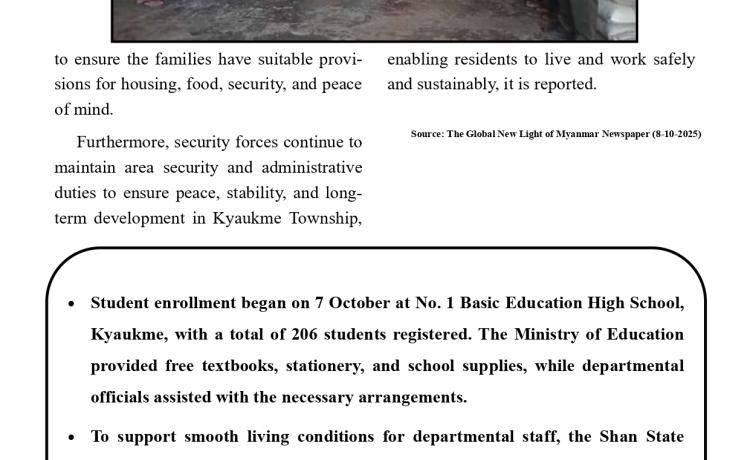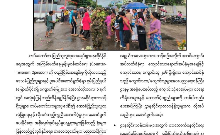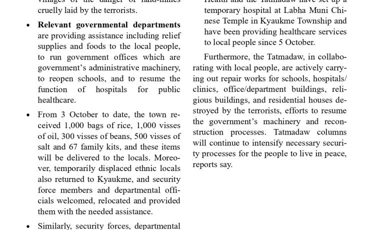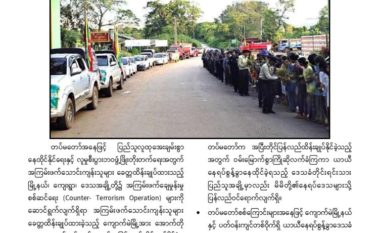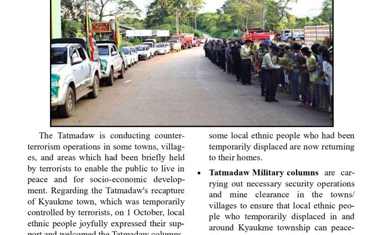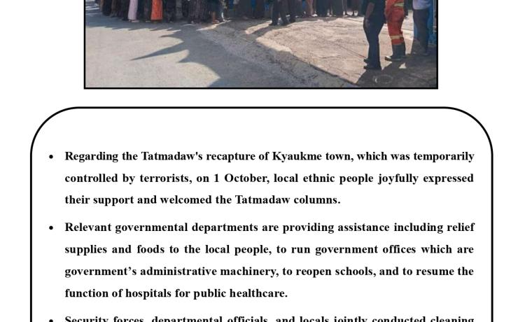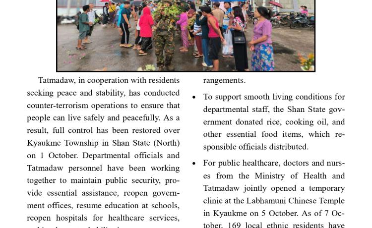 တပ်မတော်က ပြည်သူလူထု အေးချမ်းစွာနေထိုင်နိုင်ရေးအတွက် အကြမ်းဖက် ချေမှုန်းမှု စစ်ဆင်ရေး (Counter- Terrorism Operation)ကို တည်ငြိမ်အေးချမ်းမှုကို လိုလားသည့် ဒေသခံပြည်သူများနှင့် ပူးပေါင်းဆောင်ရွက်ခဲ့ရာ ရှမ်းပြည်နယ်(မြောက်ပိုင်း)ရှိ ကျောက်မဲမြို့ အား အလုံးစုံပြန်လည် ထိန်းချုပ်နိုင်ခဲ့ပြီး ဌာနဆိုင်ရာ တာဝန်ရှိသူများ၊ တပ်မတော်သားများ ပူးပေါင်း၍ ဒေသခံပြည်သူလူထု လုံခြုံရေးနှင့် လိုအပ်သည့် ကူညီ ထောက်ပံ့မှုများ ဆောင်ရွက် ပေးနိုင်ရေး၊ အစိုးရ၏ အုပ်ချုပ်မှုယန္တရားများဖြစ်သည့် ရုံးများ ပြန်လည်ဖွင့်လှစ်နိုင်ရေး၊ ကလေး သူငယ်များ ပညာသင်ကြားနိုင်ရေးအတွက် စာသင်ကျောင်းများ ပြန်လည်ဖွင့်လှစ်ပေးနိုင်ရေး၊ ပြည်သူလူထု