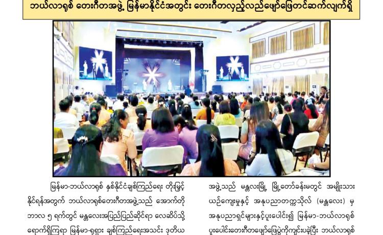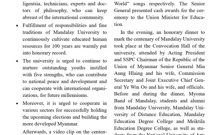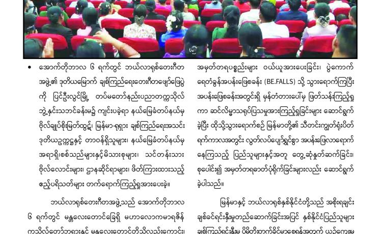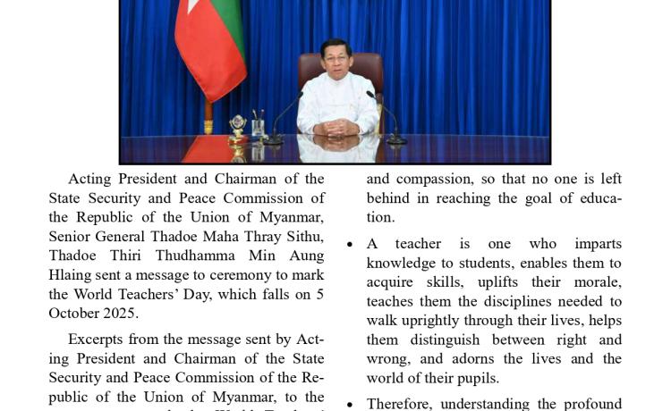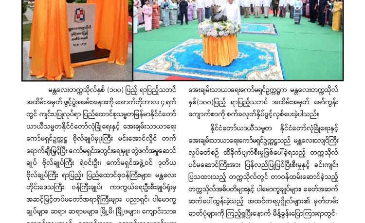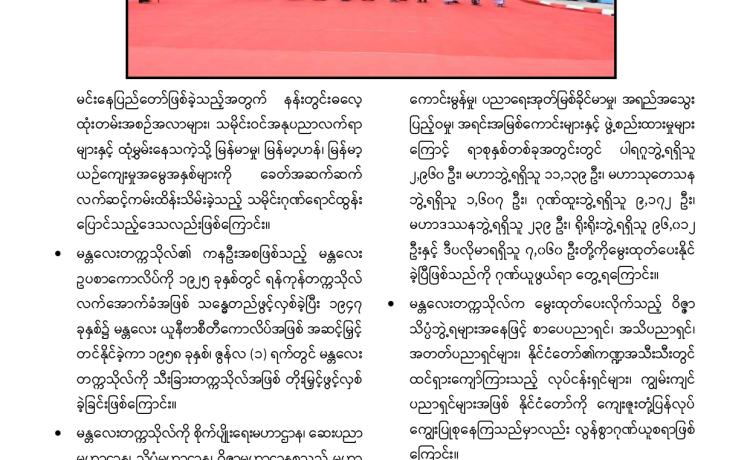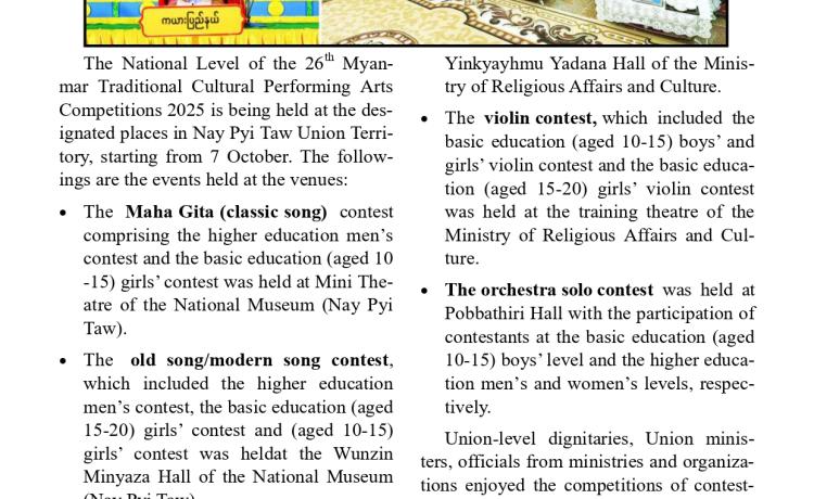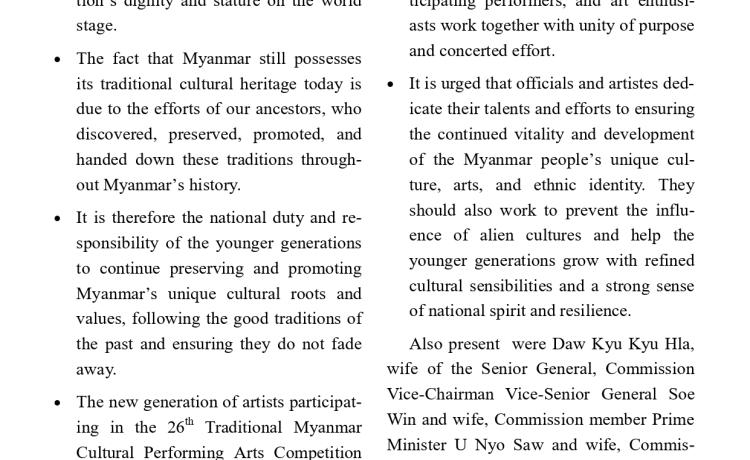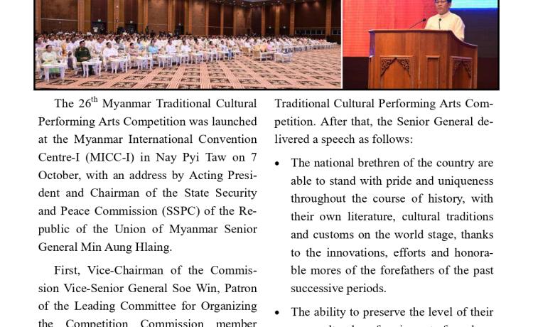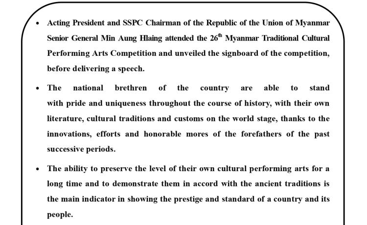 ပြည်ထောင်စုသမ္မတမြန်မာနိုင်ငံတော်ယာယီသမ္မတ နိုင်ငံတော်လုံခြုံရေးနှင့် အေးချမ်းသာယာရေးကော်မရှင်ဥက္ကဋ္ဌ ဗိုလ်ချုပ်မှူးကြီး မင်းအောင်လှိုင် (၂၆)ကြိမ်မြောက် မြန်မာ့ရိုးရာယဉ်ကျေးမှု အဆို၊ အက၊ အရေး၊ အတီးပြိုင်ပွဲ ဖွင့်ပွဲအခမ်းအနားသို့ တက်ရောက်အမှာစကားပြောကြား