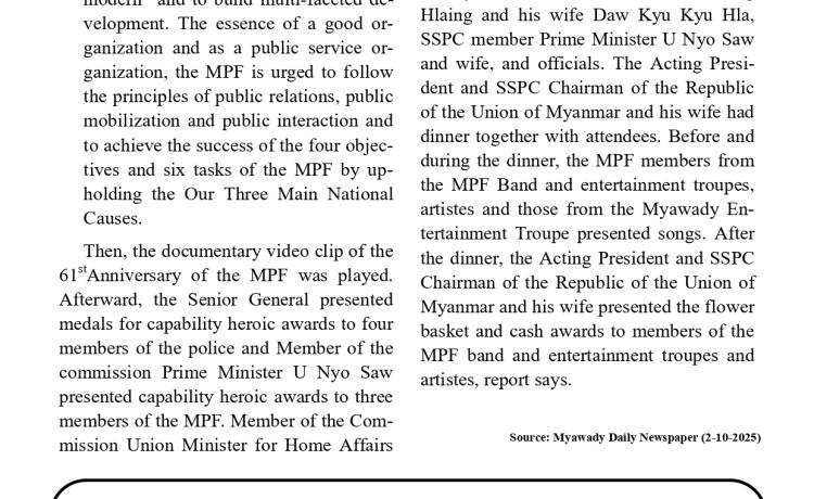 မြန်မာနိုင်ငံကမ်းခြေစောင့်တပ်ဖွဲ့၏တပ်ဖွဲ့ဖွဲ့စည်းခြင်း (၄)နှစ်မြောက်နှစ်ပတ်လည်နေ့ အခမ်းအနားကို ယနေ့နံနက်ပိုင်းတွင် ကမ်းခြေစောင့်တပ်ဖွဲ့ကွပ်ကဲမှုဌာနချုပ်၌ ကျင်းပ ပြုလုပ်ရာ ကာကွယ်ရေးဝန်ကြီးဌာန၊ ပြည်ထောင်စုဝန်ကြီး ဗိုလ်ချုပ်ကြီး မောင်မောင်အေး တက်ရောက် ဂုဏ်ပြုချီးမြှင့်ခဲ့သည်။