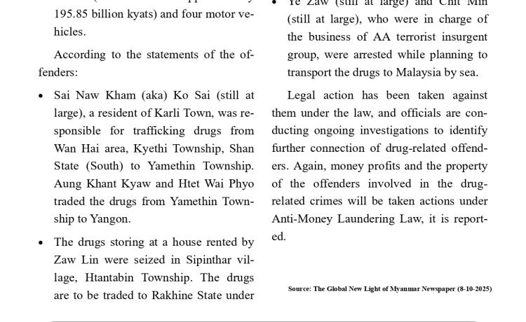 AA အကြမ်းဖက်သောင်းကျန်းသူများ၏ မူးယစ်ဆေးဝါး သယ်ယူပို့ဆောင်၊ ရောင်းချနေသော လုပ်ငန်းများနှင့်ပတ်သက်ပြီး အမျိုးသားကာကွယ်ရေးနှင့် လုံခြုံရေးကောင်စီ သတင်းထုတ်ပြန်ရေး အဖွဲ့ခေါင်းဆောင် ဗိုလ်ချုပ်ဇော်မင်းထွန်း၏ ပြောကြားချက်