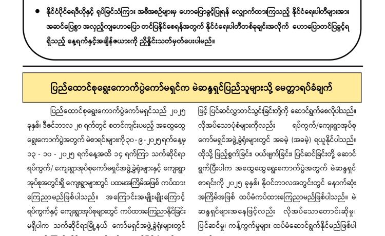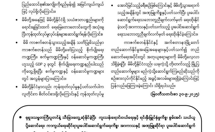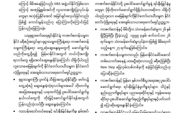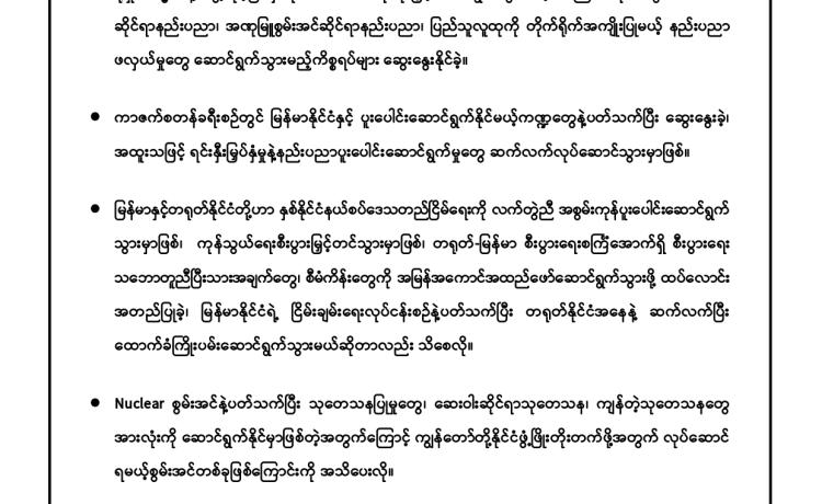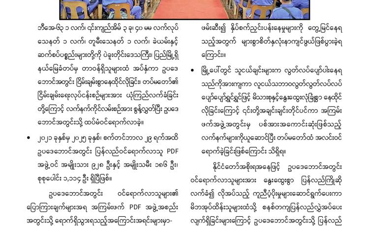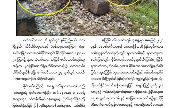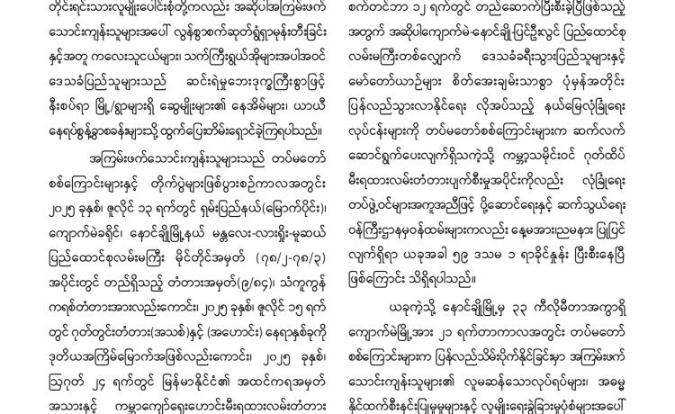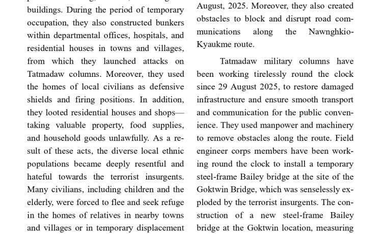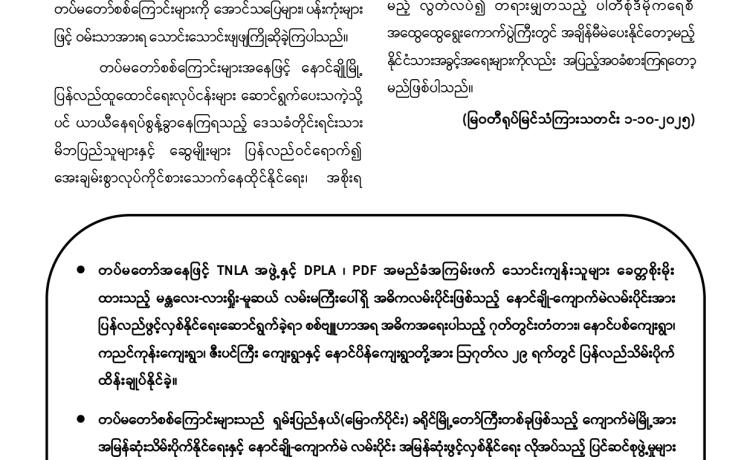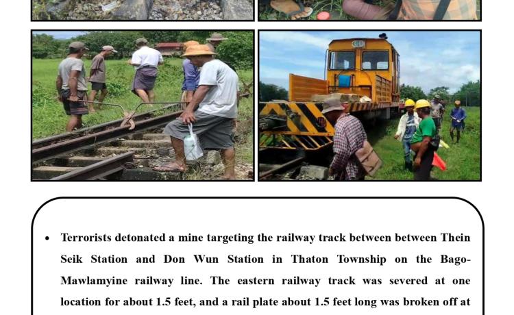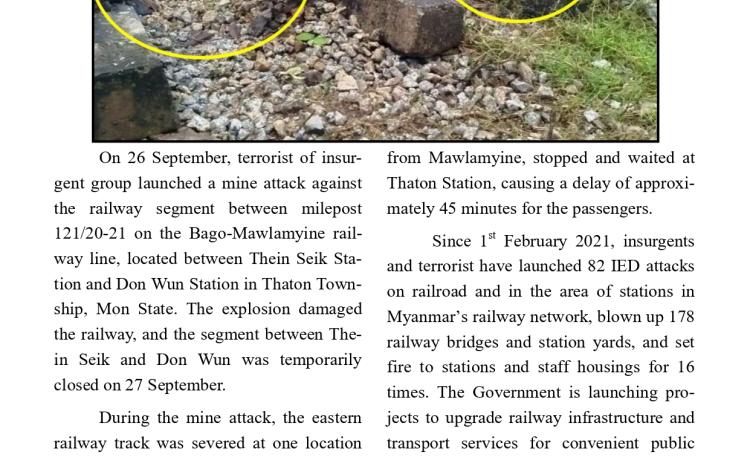 PDF အမည်ခံအစွန်းရောက်အကြမ်းဖက်သမားများသည် သာသနာတော် အကျိုး သယ်ပိုး လျက်ရှိသော ရဟန်းသံဃာတော်များ ၊ အေးချမ်းစွာနေထိုင်လျက်ရှိသော အပြစ်မဲ့အရပ်သား ပြည်သူများ၊ နိုင်ငံ့ဝန်ထမ်းများနှင့် အရွယ်မရောက်သေးသူ ကလေး သူငယ်များအား သေဆုံး၊ ထိခိုက်ဒဏ်ရာရရှိစေရန်နှင့် အကြောက်တရားလွှမ်းမိုးစေရန် ရည်ရွယ်ချက်များဖြင့် အကြမ်းဖက် လုပ်ရပ်များအား လူမဆန်စွာ ဖောက်ခွဲရေးပစ္စည်း ကိရိယာများအသုံးပြု၍ မိုင်းထောင်ဖောက်ခွဲခြင်း၊ အဝေးမှပစ်ခတ်ဖောက်ခွဲခြင်းများ၊ အကြောင်းမဲ့ဖမ်းဆီး သတ်ဖြတ်ခြင်းများအား ယုတ်မာရိုင်းစိုင်း၍ အသိတရား ကင်းမဲ့စွာ ကျူးလွန်လုပ်ဆောင်လျက်ရှိသည်။