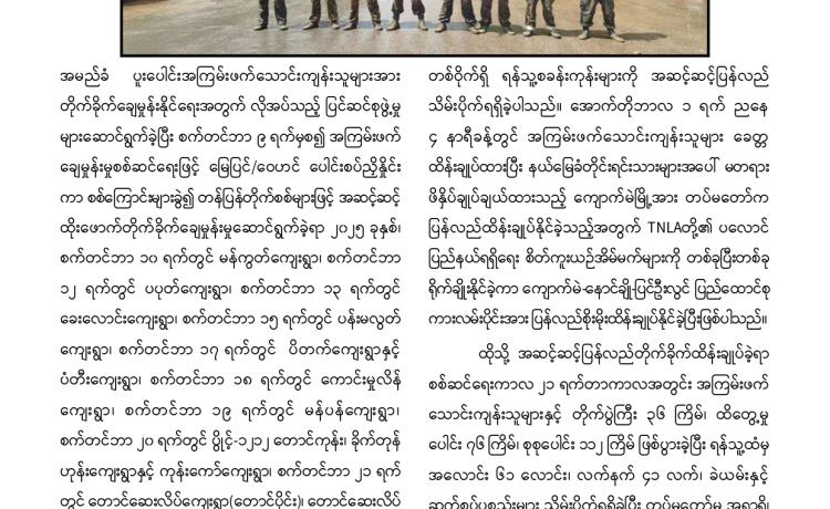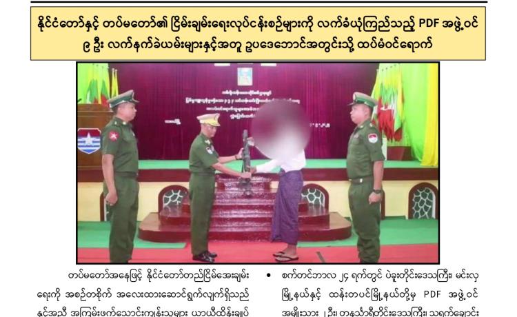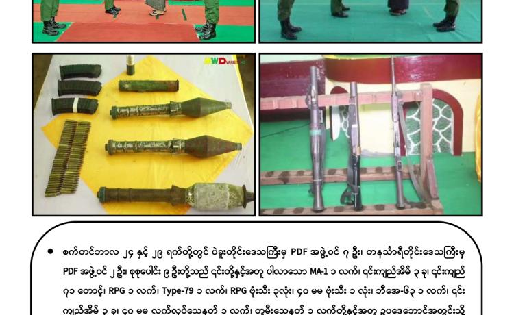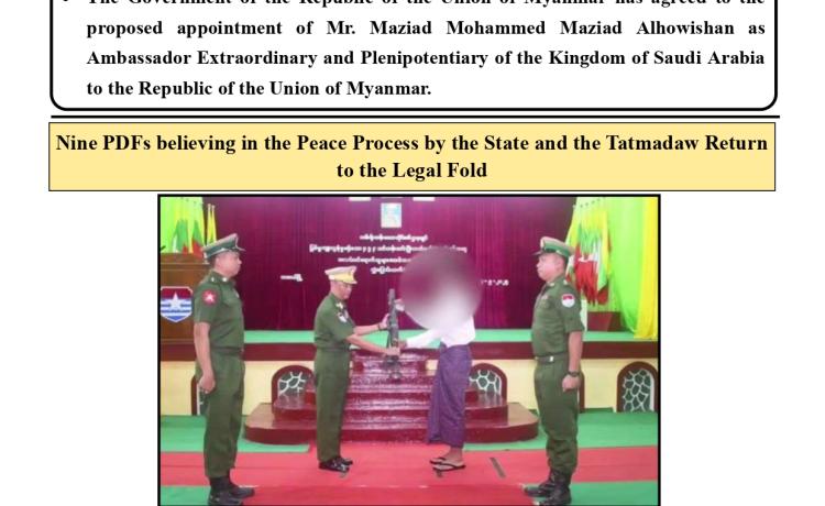 နိုင်ငံတော်နှင့် တပ်မတော်၏ ငြိမ်းချမ်းရေးလုပ်ငန်းစဉ်များကို လက်ခံယုံကြည်သည့် DPLA ၊ KNDF ၊ PNLO ၊ ကရင်နီအမျိုးသားလွတ်မြောက်ရေးတပ်ပေါင်းစု နှင့် PDF အမည်ခံအဖွဲ့ဝင် ၃၀ ဦးတို့သည် လက်နက်ခဲယမ်းများနှင့်အတူ ဉပဒေဘောင်အတွင်းသို့ ထပ်မံဝင်ရောက်