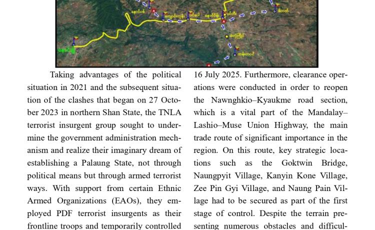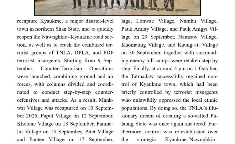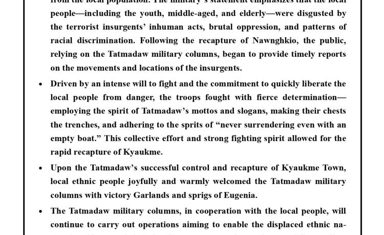 တပ်မတော်က ပြည်သူလူထု အေးချမ်းစွာနေထိုင်နိုင်ရေးအတွက် အကြမ်းဖက် ချေမှုန်းမှုစစ်ဆင်ရေး (Counter- Terrorism Operation)ကို ဆောင်ရွက်ခဲ့ရာ ရှမ်းပြည်နယ်(မြောက်ပိုင်း)ရှိ ကျောက်မဲမြို့အား အလုံးစုံပြန်လည် ထိန်းချုပ်နိုင်ခဲ့ပြီး ကျောက်မဲမြို့၌ အစိုးရအုပ်ချုပ်ရေးယန္တရားများ ပြန်လည်လည်ပတ်နိုင်ရေးနှင့် မြို့ပြန် လည်တည်ဆောက်ရေးလုပ်ငန်းများ ဆောင်ရွက်နိုင်ရန်အတွက် လိုအပ်သည့် ပြန်လည် ထူထောင်ရေးလုပ်ငန်းများကို ဒေသခံပြည်သူလူထုနှင့်ပူးပေါင်း၍ အင်တိုက်အားတိုက် ဆောင်ရွက်ပေးလျက်ရှိသည်။
