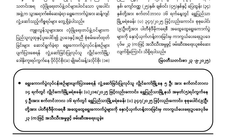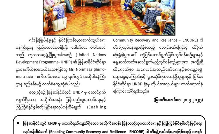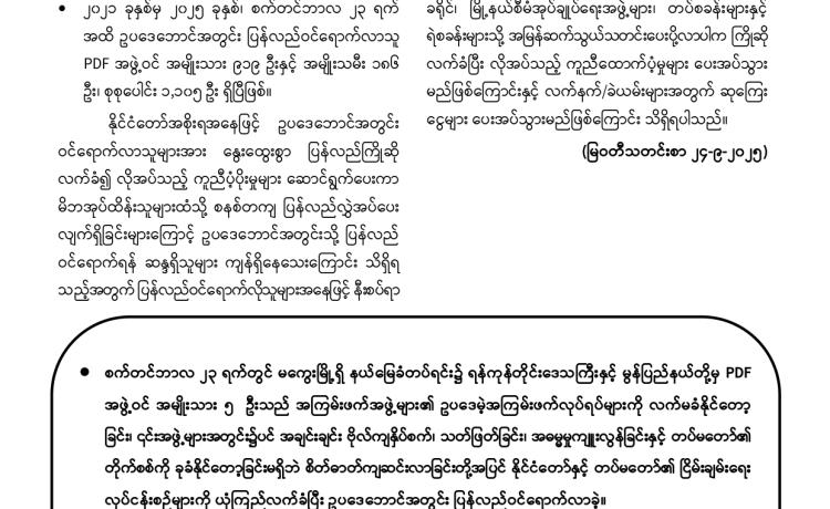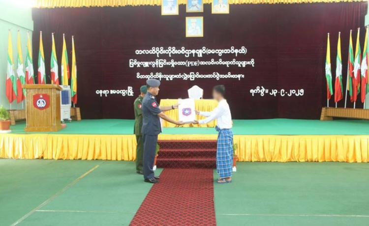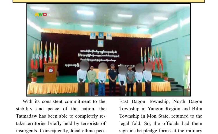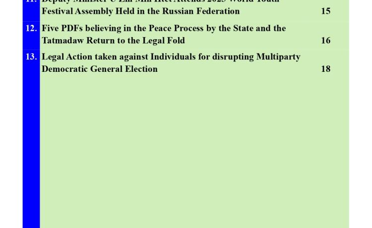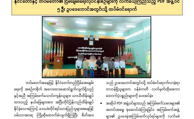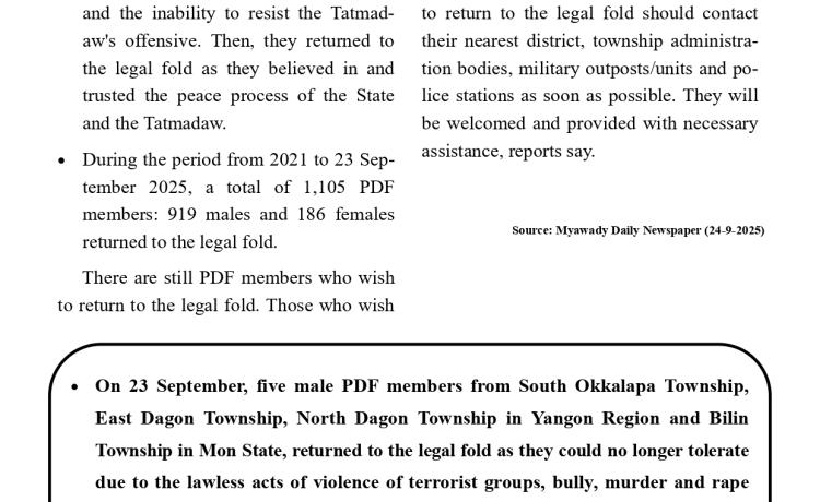 နိုင်ငံတော်အစိုးရသည် PDF အပါအဝင် အဖွဲ့အစည်းအမျိုး မျိုးအမည်ခံ၍ လက်နက်ကိုင်ဆန့်ကျင်လျက်ရှိသည့်် အဖွဲ့အစည်းများအတွင်း ရောက်ရှိနေသူများအား ဉပဒေဘောင်အတွင်းသို့ ပြန်လည်ဝင်ရောက်ရန် ဖိတ်ခေါ်၍ ဉပဒေဘောင်အတွင်းသို့ ပြန်လည်ဝင်ရောက်လာကြသူများကိုလည်း လိုအပ်သည့် ကူညီပံ့ပိုးမှုများ ဆောင်ရွက် ပေးလျက်ရှိရာ နိုင်ငံတော်နှင့် တပ်မတော်၏ ငြိမ်းချမ်းရေးလုပ်ငန်းစဉ်များကို နားလည် သဘောပေါက်လာသည့် PDF အမည်ခံအဖွဲ့မှ အဖွဲ့ဝင်(၅)ဦးသည် ယနေ့တွင် ဉပဒေ ဘောင်အတွင်းသို့ ထပ်မံဝင်ရောက်လာကြသည်။