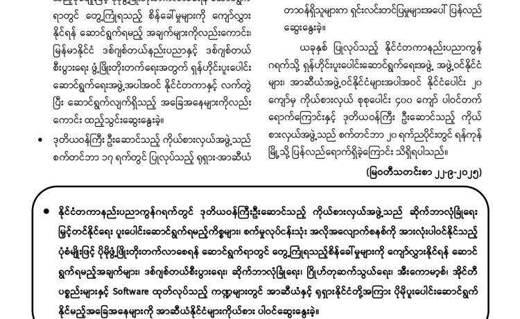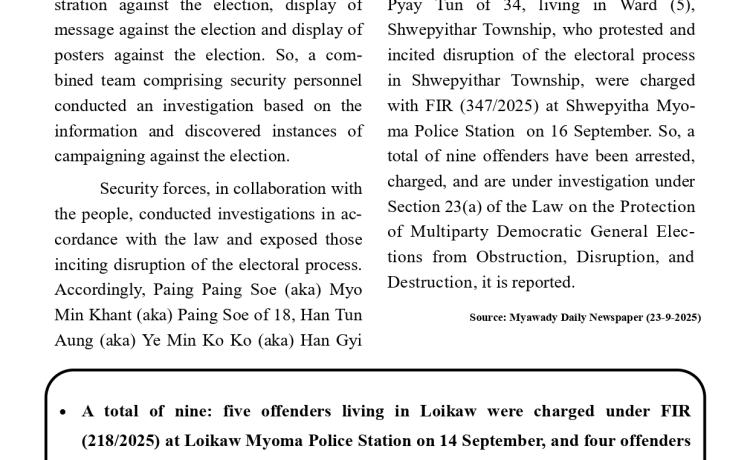 နိုင်ငံတော်အစိုးရအနေဖြင့် အွန်လိုင်းလိမ်လည်မှု(Telecom Fraud)နှင့် ဒုစရိုက်မှုလုပ်ငန်း များကို အိမ်နီးချင်းနိုင်ငံများအပါအဝင် နိုင်ငံတကာမှအဖွဲ့အစည်းများနှင့်ပူးပေါင်း၍ စုံစမ်းဖော်ထုတ် တိုက်ဖျက်လျက်ရှိပြီး ကရင်ပြည်နယ်၊ မြဝတီမြို့-ရွှေကုက္ကိုလ်၊ မဲ့ထော်သလေး(KK Park) နယ်မြေ များတွင် အွန်လိုင်းလောင်းကစားမှုများ၊ အွန်လိုင်းလိမ်လည်မှုများအပါအဝင် ဒုစရိုက်မှုများကျူးလွန် ခဲ့ကြသည့် နီပေါနိုင်ငံသား ခုနှစ်ဦး၊ အင်ဒိုနီးရှားနိုင်ငံသား ငါးဦး၊ တရုတ်နိုင်ငံသား လေးဦးနှင့် ရုရှား နိုင်ငံသား တစ်ဦး၊ စုစုပေါင်း ပြည်ပနိုင်ငံသား ၁၇ ဦးကို ယနေ့တွင် ထပ်မံစစ်ဆေးဖော်ထုတ် ထိန်းသိမ်းနိုင်ခဲ့သည်။