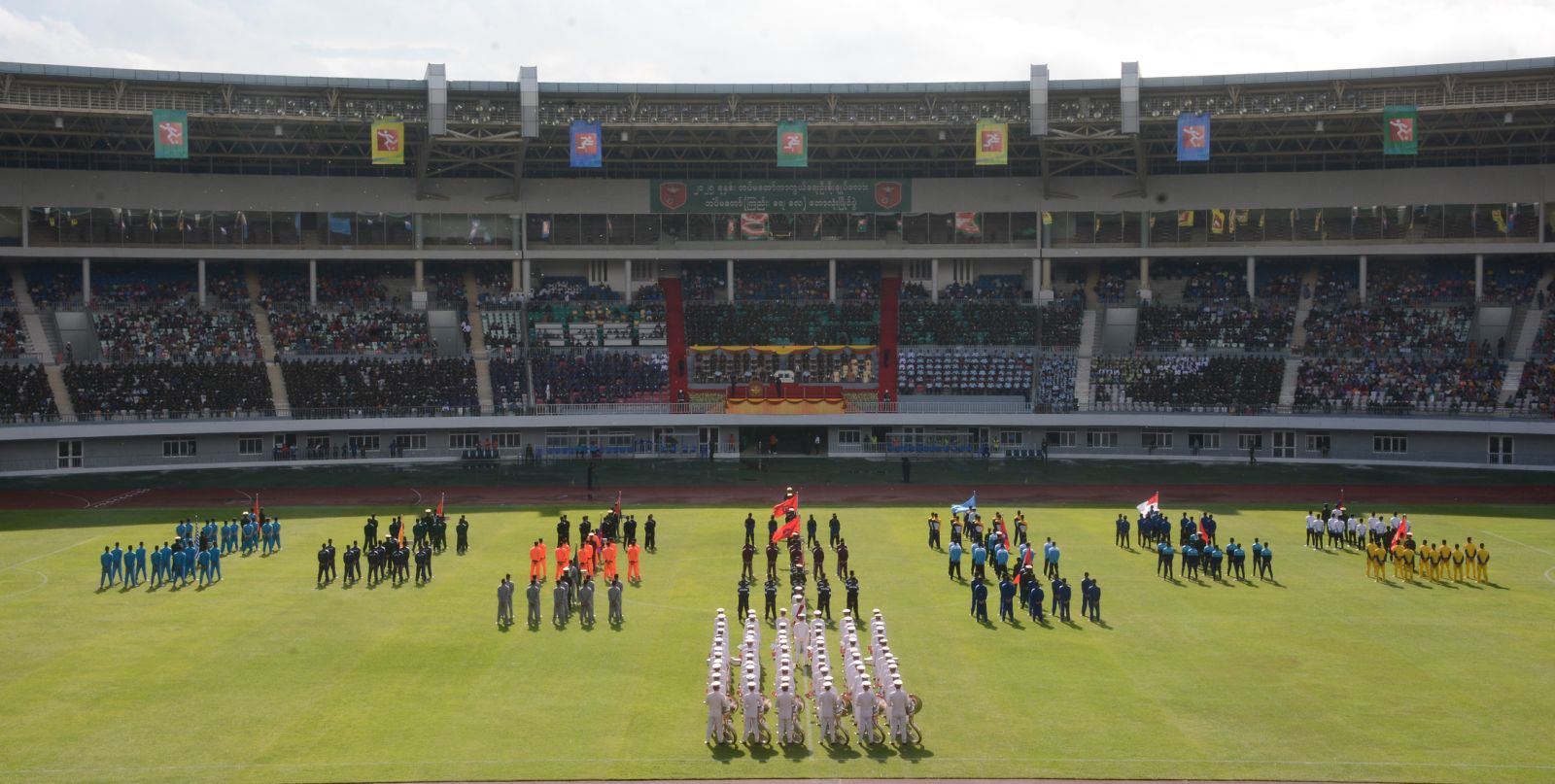 ဦးစွာ နိုင်ငံတော်စစ်တီးဝိုင်းအဖွဲ့က ကွင်းအတွင်း ဝင်ရောက်နေရာယူပြီး စစ်ရေးပြမှူးကြီးဦးဆောင်သော အလံတော်အဖွဲ့နှင့် အားကစားအသင်း ၁၇ သင်းမှ အားကစားသမားများနေရာယူကြသည်။ ထို့နောက် စစ်ရေးပြမှူးကြီး ဦးဆောင်သော အလံတော်အဖွဲ့နှင့် အားကစားသမားများက တပ်မတော်အားကစားနှင့် ကာယပညာ အုပ်ချုပ်ရေးအဖွဲ့ဥက္ကဋ္ဌ စစ်ရေးချုပ်အား အလေးပြုကြသည်။