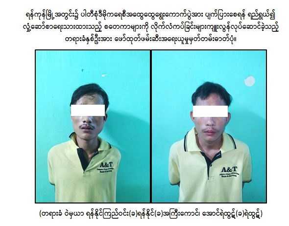 ဖြစ်စဉ်တွင် ပြစ်မှုကျူးလွန်သူများအား ဖော်ထုတ်ဖမ်းဆီးရမိနိုင်ရေးအတွက် ဆက်လက် ဆောင်ရွက်ခဲ့ရာ ပြစ်မှုကျူးလွန်ခဲ့သည့် လှိုင်သာယာ(အရှေ့ပိုင်း)မြို့နယ်၊ အမှတ်(၆)ရပ်ကွက် နေသူများဖြစ်ကြသည့် အောင်ရဲထွဋ်(ခ)ရဲထွဋ်(၂၄)နှစ်နှင့် ရန်နိုင်ကြည်ဝင်း(ခ)ရန်နိုင်(ခ) အကြီး ကောင်(၂၃)နှစ်တို့ကို စက်တင်ဘာလ ၁၈ ရက်နေ့ ညနေ ၅ နာရီ ၅ မိနစ်တွင် ၎င်းတို့နေအိမ်မှ ဖမ်းဆီးရမိခဲ့ကြောင်းနှင့် ၎င်းတို့၏ ထွက်ဆိုချက်များအရ ၎င်းတို့သည် ပါတီစုံဒီမိုကရေစီအထွေထွေ ရွေးကောက်ပွဲအား ပျက်ပြားစေရန် ရည်ရွယ်၍ စက်တင်ဘာလ ၁၃ ရက်တွင် လှိုင်သာယာ (အရှေ့ပိုင်း)မြို့နယ်နှင့် လှိုင်သာယာ(အနောက်ပိုင်း)မြို့နယ်အတွင်းရှိ အများပြည်သူနှင့် သက်ဆိုင် သောနေရာ ၁၀ နေရာ၌ ပါတီစုံဒီမိုကရေစီအထွေထွေရွေးကောက်ပွဲများကို ပျက်ပြားစေရန် ရည်ရွယ်ရေးသားထားသည့် စာသားပါစတေကာများဖြင့် အသိပေးလှုံ့ဆော်ခြင်းများ လုပ်ဆောင်ခဲ့ ကြောင်း ဖော်ထုတ်သိရှိရကြောင်းနှင့် ပြစ်မှုကျူးလွန်သူများအား ဥပဒေနှင့်အညီ ထိရောက်စွာ အရေးယူနိုင်ရေး ဆက်လက်ဆောင်ရွက်လျက်ရှိကြောင်း သတင်းရရှိသည်။