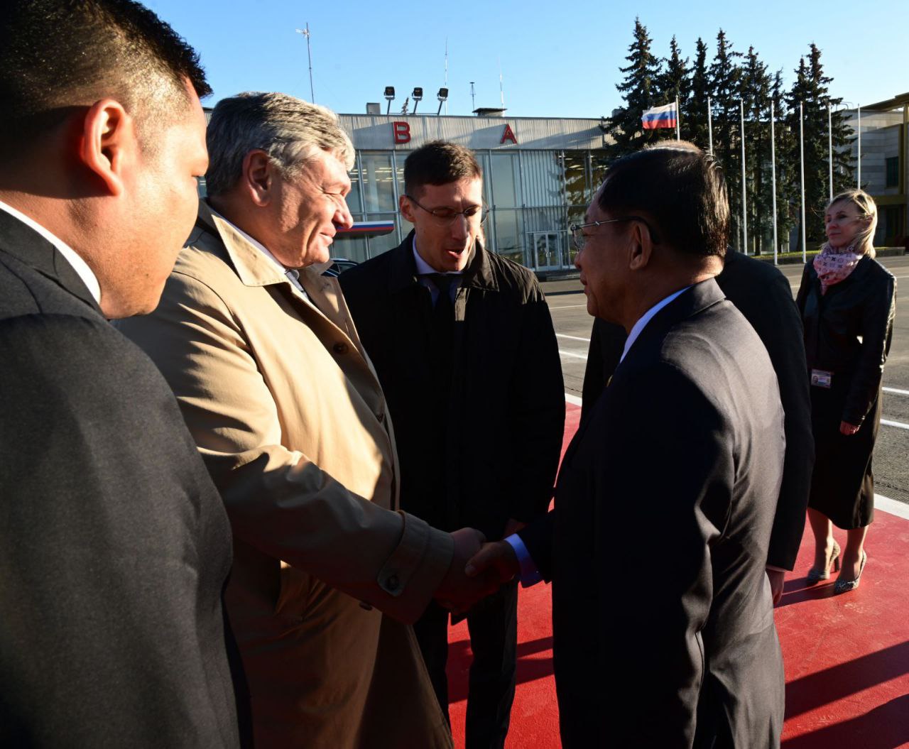 ထို့နောက် နိုင်ငံတော်ယာယီသမ္မတ နိုင်ငံတော်လုံခြုံရေးနှင့် အေးချမ်း သာယာ ရေးကော်မရှင်ဥက္ကဋ္ဌ ဦးဆောင်သည့် မြန်မာအဆင့်မြင့်ကိုယ်စားလှယ်အဖွဲ့သည် ညပိုင်း တွင် မော်စကိုမြို့ရှိ ဘနူကာဘာအပြည်ပြည်ဆိုင်ရာလေဆိပ်သို့ ရောက်ရှိကြရာ ရုရှား ဖက်ဒရေးရှင်းနိုင်ငံ၊ နိုင်ငံခြားရေးဝန်ကြီးဌာန ဒုတိယဝန်ကြီး Mr. Andrey Rudenko နှင့် တာဝန်ရှိသူများ၊ ရုရှားဖက်ဒရေးရှင်းနိုင်ငံဆိုင်ရာ မြန်မာနိုင်ငံသံအမတ်ကြီး ဦးသစ်လင်းအုန်း၊ မြန်မာစစ်သံ (ကြည်း၊ ရေ၊ လေ) ဗိုလ်မှူးချုပ် ကျော်စိုးဦး တို့က လှိုက်လှဲနွေးထွေးစွာ ကြိုဆို နှုတ်ဆက်ခဲ့ကြကြောင်း သတင်းရရှိသည်။