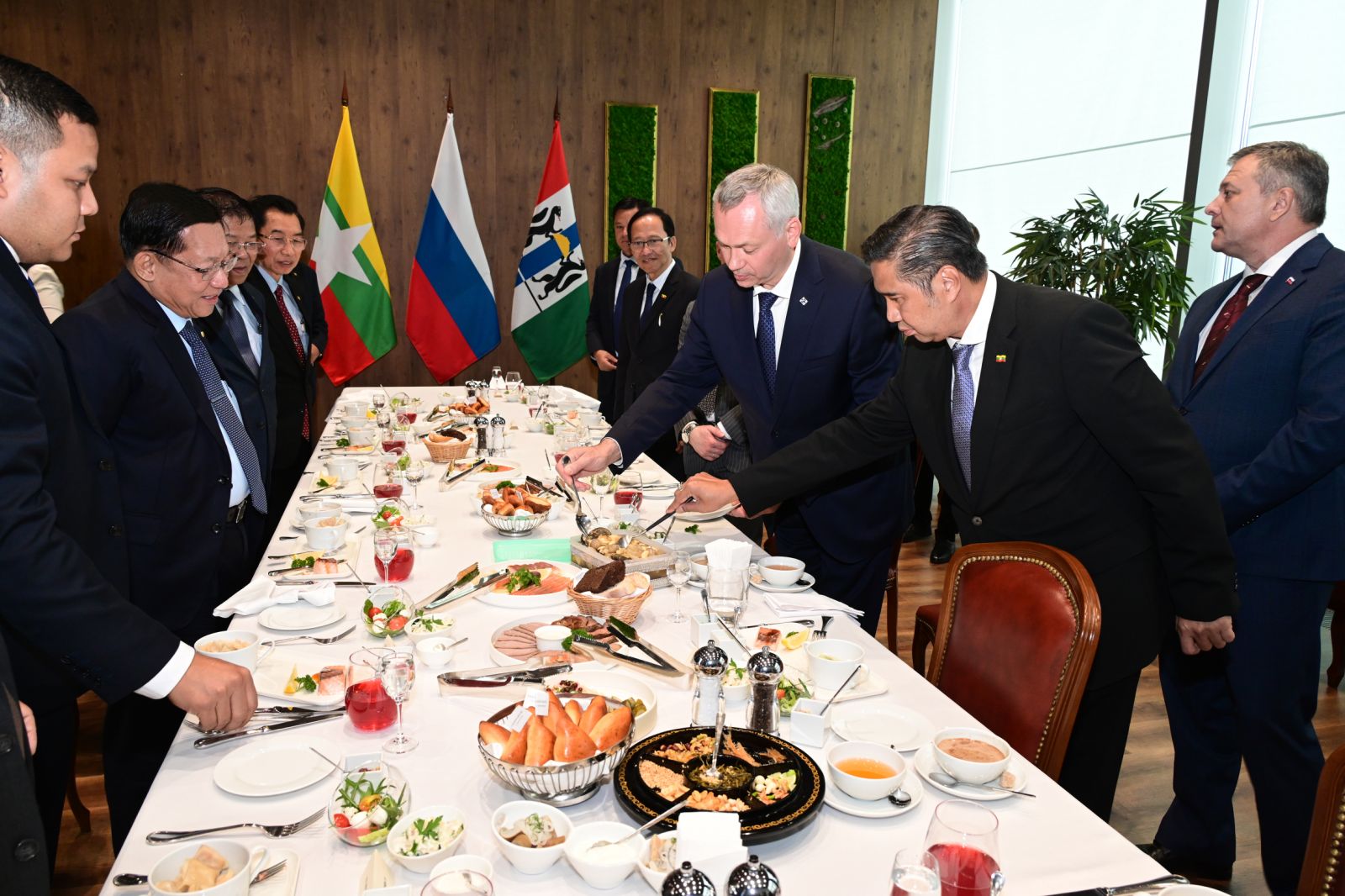 ထိုသို့တွေ့ဆုံဆွေးနွေးစဉ် မြန်မာနိုင်ငံမှ အသင့်ပြင်ဆင်လာသည့် မြန်မာ့ရိုးရာ အစားအစာဖြစ်သည့် လက်ဖက်အုပ်၊ လက်ဖက်ရည်၊ အသင့်ချက်ပြုတ်လာသည့် ငါးသလောက်ပေါင်းတို့ဖြင့် တည်ခင်းဧည့်ခံခဲ့ရာ နိုဗာစီဗစ်ဒေသ အုပ်ချုပ်ရေးမှူးနှင့် အဖွဲ့ဝင်များက မြိန်ယှက်စွာသုံးဆောင်ခဲ့ကြပြီး နိုင်ငံတော်ယာယီသမ္မတ နိုင်ငံတော် လုံခြုံရေးနှင့် အေးချမ်းသာယာရေးကော်မရှင်ဥက္ကဋ္ဌက မြန်မာ့ရိုးရာစားသောက်ဖွယ် ရာများနှင့် ပတ်သက်၍ ရှင်းလင်း ပြောကြားခဲ့သည်။